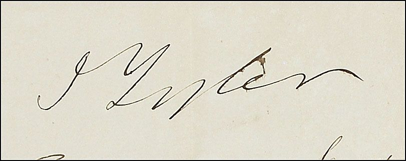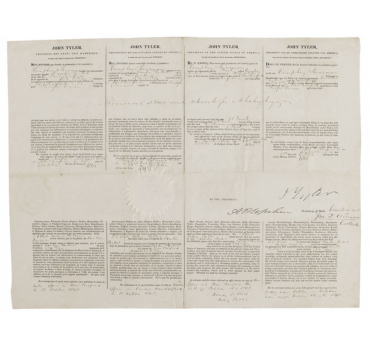 Partly-printed DS as president, signed “J. Tyler,” one page, 20.75 x 16, October 13, 1845. Four language ship’s paper issued to “Humphrey Shearman, master or commander of the Bark called Cantin Packet…lying at present in the port of New Bedford bound for Pacific Ocean and laden with provisions, stores, and utensils for a whaling voyage.” Signed in the middle of the fourth panel by Tyler and countersigned by Secretary of State Abel Upshaw. In very good condition, with intersecting folds, one through a single letter of signature, old reinforcement along reverse of central vertical fold, scattered toning, and a couple of minor separations along folds. The white wafer seal is crisp and intact. A well-preserved example with Tyler’s signature quite large and prominent. Oversized.