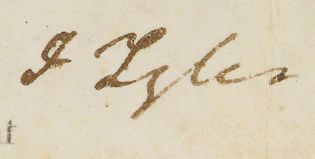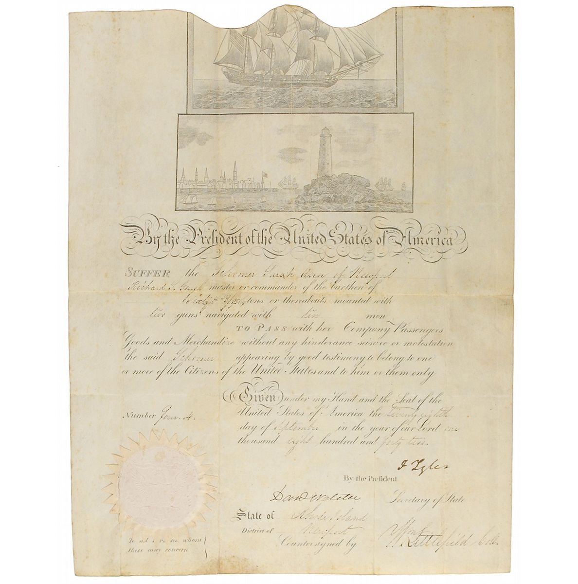 Partly-printed vellum DS as president, signed “J. Tyler,” one page, 11.75 x 15, September 26, 1842. Scalloped-top ship’s pass issued for “the Schooner Sarah Ann of Newport, Richard S. Gough master or commander…mounted with two guns navigated with ten men to pass with her Company, Passengers, Goods and Merchandize without any hinderance, seisure or molestation.” Boldly signed at the conclusion by President Tyler and countersigned by Secretary of State Daniel Webster. In very good condition, with intersecting folds (one vertical fold passing through the very last letter of the signature), and scattered foxing and staining. Tyler ship’s papers are considered scarce, and with this example is highlighted by an especially bold signature.