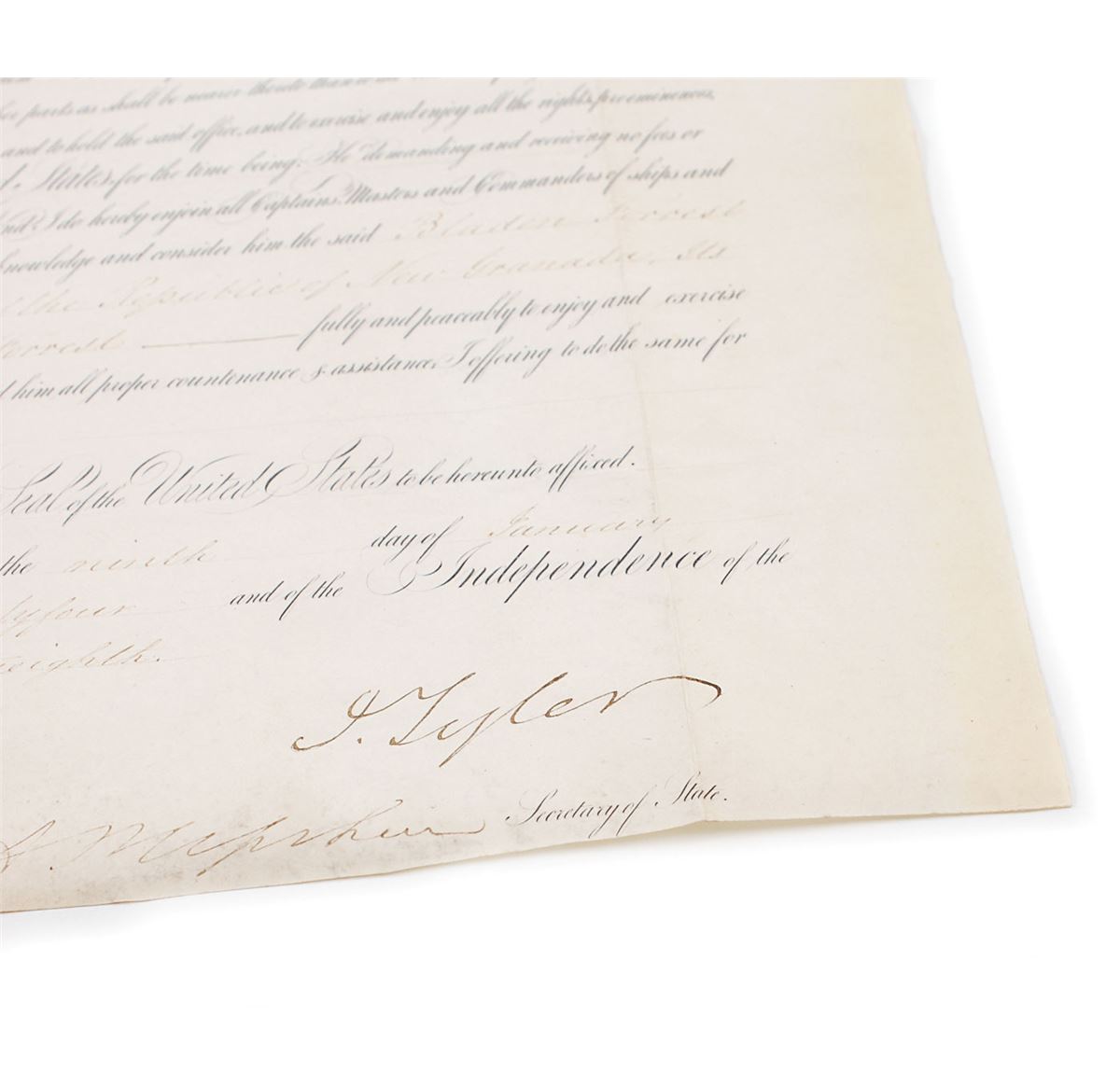 Partly-printed vellum DS as president, signed “J. Tyler,” one page, 16.75 x 12.75, January 9, 1844. President Tyler appoints Bladen Forrest of Washington as “Consul of the United States for the Porte Chagres…and request The Government of the Republic of New Granada, Its Governors and Officers to permit the said Bladen Forrest fully and peaceably to enjoy and exercise the said office.” Crisply signed at the conclusion by President Tyler and countersigned by Secretary of State Abel P. Upshur. The white paper seal affixed to the lower left remains fully intact. In fine condition, with intersecting folds, toning and soiling to edges, and the text in the body light but legible.