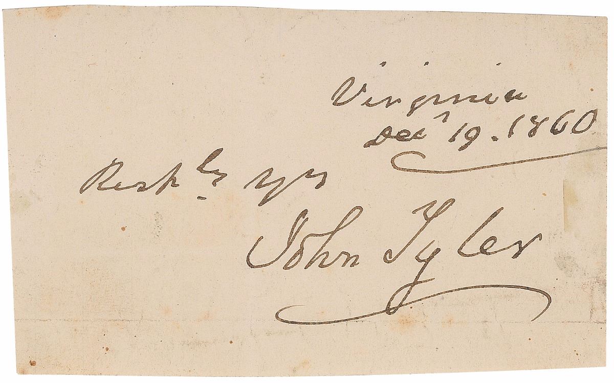 Crisp ink signature, “Resp’ly yrs, John Tyler, Virginia, Dec 19, 1860,” on an off-white 4 x 2.5 slip clipped from the close of a letter. Intersecting folds (passing through the signature) and light scattered soiling, otherwise fine condition.