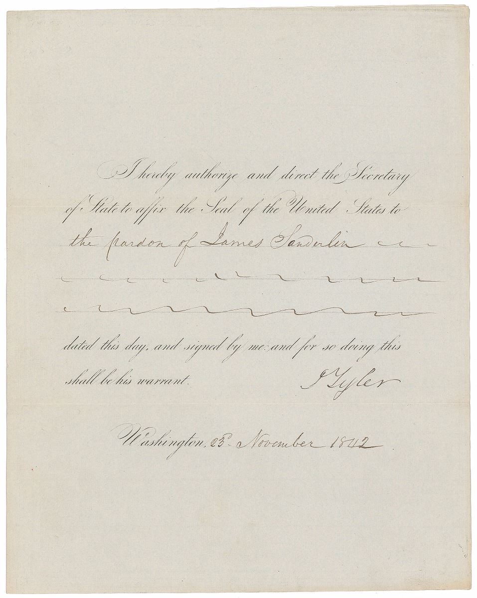 Partly-printed DS as president, signed “J. Tyler,” one page, 8 x 10, November 23, 1842. President Tyler directs the Secretary of State to “affix the Seal of the United States to the pardon of James Sanderlin.” In fine condition. An exquisitely preserved example of this sought-after format.