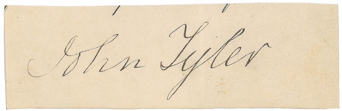 Ink signature, “John Tyler,” on an off-white 4.5 x 1.25 vellum slip clipped from a document. In fine condition. Accompanied by an engraved portrait of Tyler bearing a facsimile signature.