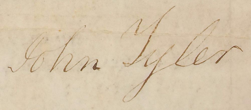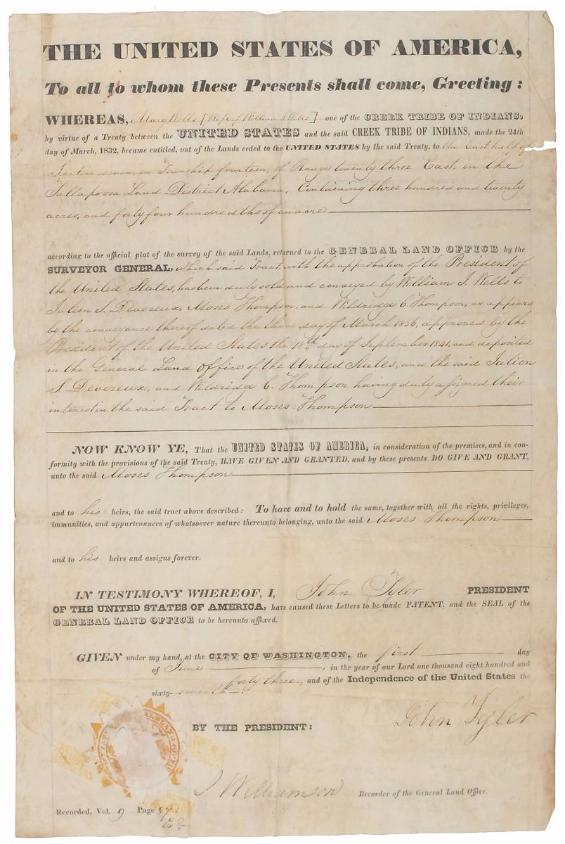Partly-printed vellum DS as president, one page, 11.5 x 17.75, June 1, 1843. Uncommon land office grant approved by Tyler, in part: “Whereas, Mary Wells (Wife of William J Wells) one of the Creek tribe of Indians, by virtue of a Treaty between the United States and the said Creek tribe of Indians, made the 24th day of March 1832, became entitled, out of the Lands ceded to the United States by the said Treaty, to the East half of the Section, in Township fourteen of Range Twenty three East, in the Tallapoosa Land District Alabama, containing three hundred and twenty acres, and forty four hundreths of an acre.” Signed at the conclusion by Tyler and countersigned by Recorder of the General Land Office J. Williamson. In very good condition, with intersecting folds, paper loss to upper right, tape remnants to the seal, and scattered overall soiling.