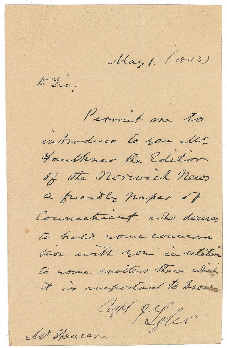 ALS signed “J. Tyler,” one page, 4.5 x 7, May 1, 1843 (year in another hand). Letter to [John Canfield] Spencer, in full: “Permit me to introduce to you Mr. Faulkner the Editor of the Norwich News a friendly paper of Connecticut, who desires to hold some conversation with you in relation to some matters there which it is important to know.” In fine condition. Ex. Robert Batchelder, November 16, 1988; sale 68, lot 260.