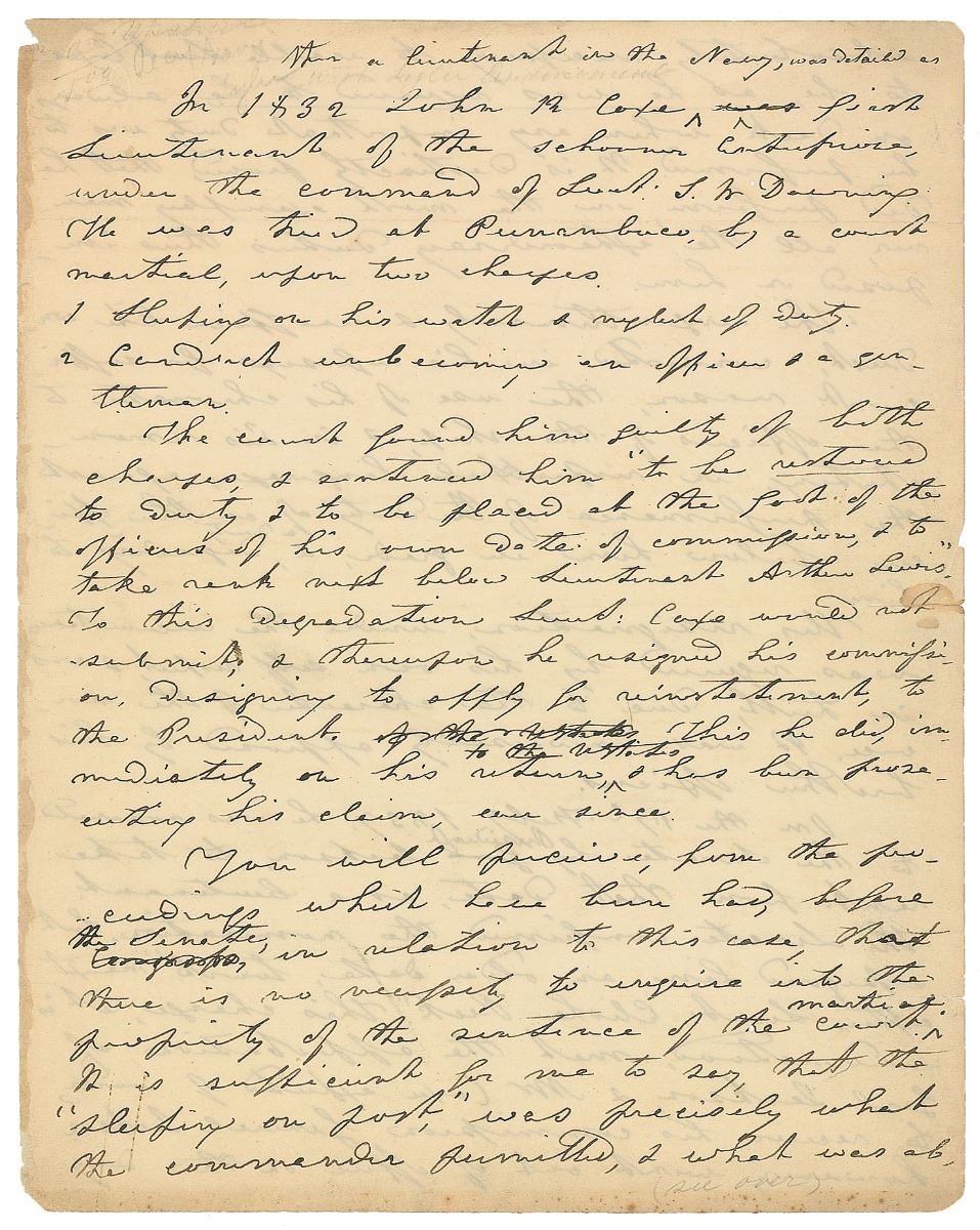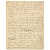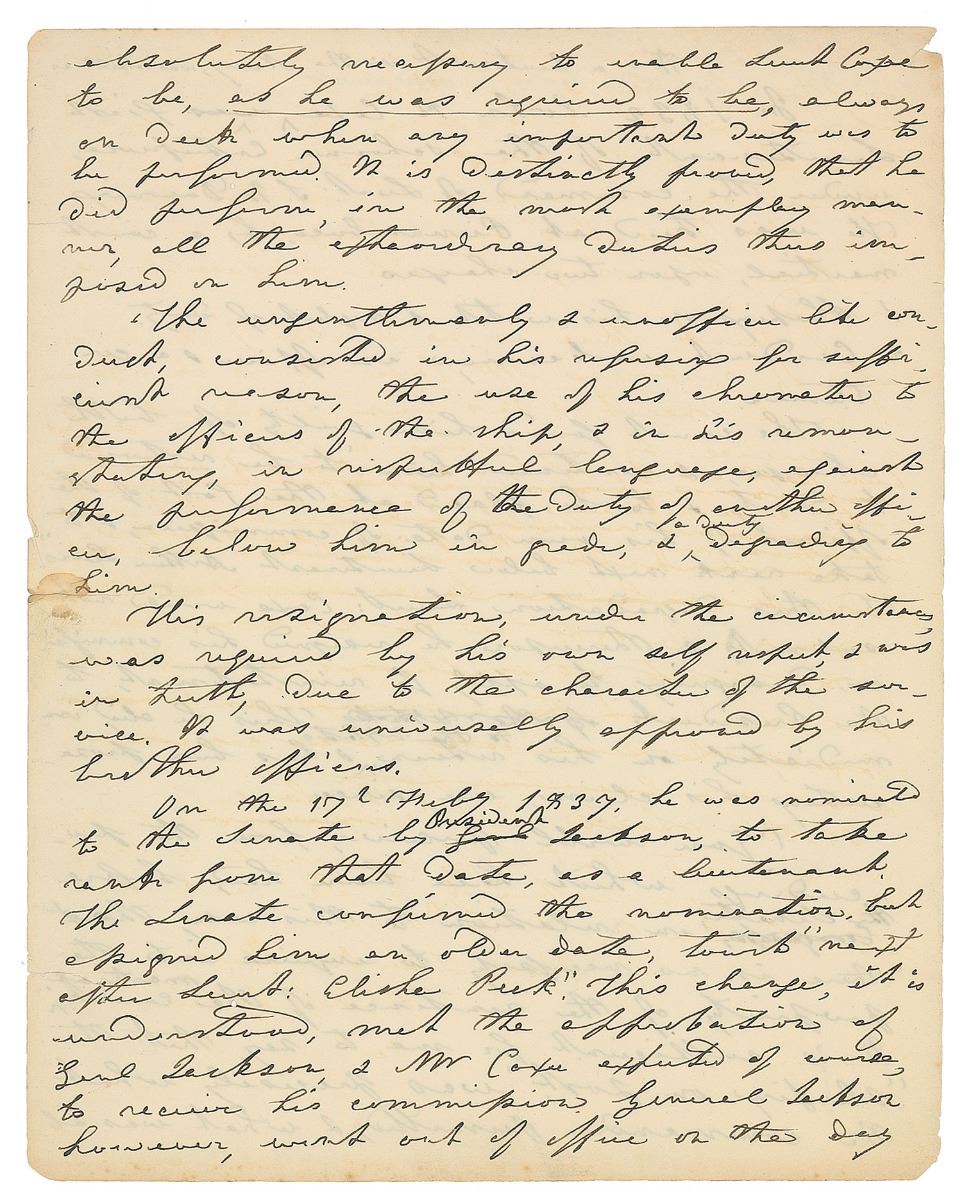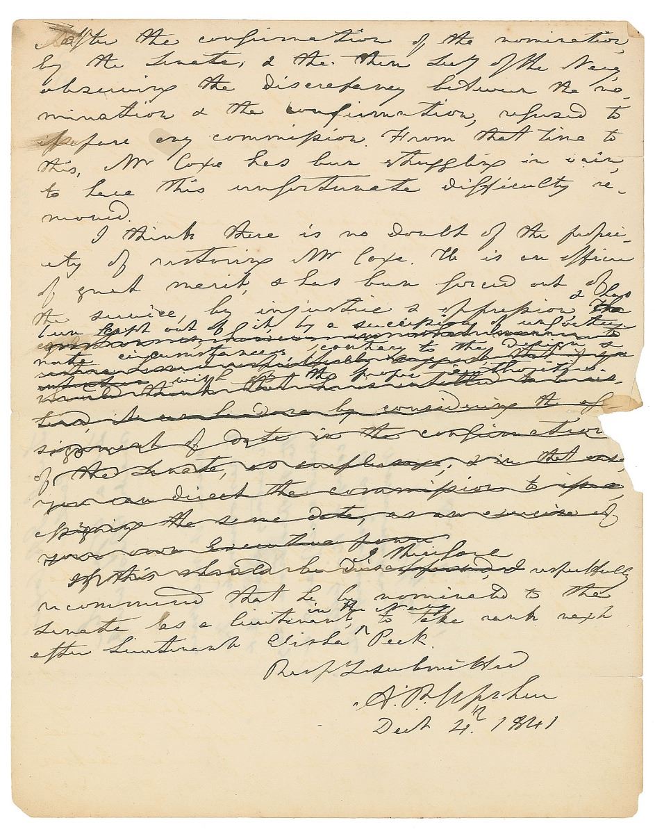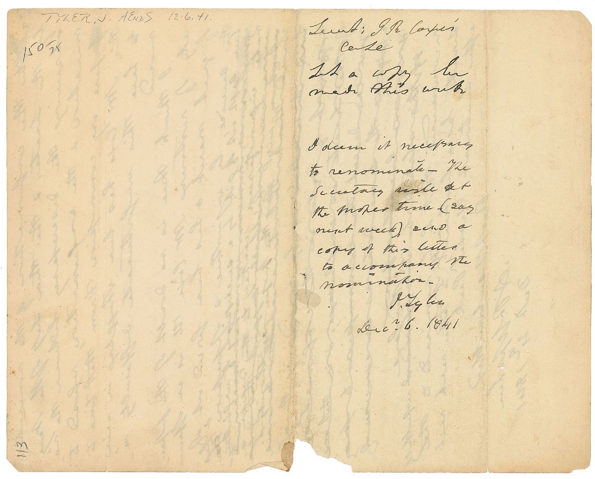 Autograph endorsement signed as president, “J. Tyler,” dated December 6, 1841, penned on the reverse of the last page of an ALS by Secretary of the Navy Abel P. Upshur, three pages on two sheets, 7.75 x 9.75, December 4, 1841. Upshur’s letter explains that Lt. John R. Coxe was irrationally court-martialed, and though exonerated, was passed over because his re-nomination happened on the day President Andrew Jackson left office. President Tyler writes, in full: “I deem it necessary to renominate—The Secretary will at the proper time (say next week) send a copy of this letter to accompany the nomination.” In fine condition, with paper loss to one edge of the second sheet (affecting a few words of Upshur’s letter but none of Tyler’s writing), and a few small stains and edge tears. Provenance: The Everett Fisher Collection.