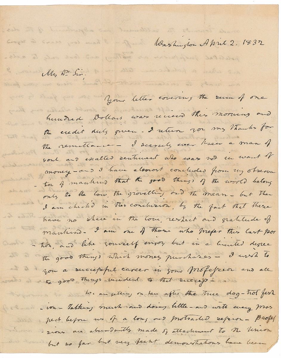 ALS, three pages on two adjoining sheets, 8.25 x 10, April 2, 1832. Letter to Governor James Iredell, Jr., of North Carolina. In part: “Your letter covering the sum of one hundred Dollars was received this morning and the credit duly given. I return you my thanks for the remittance. I scarcely ever knew a man of soul and exalted sentiment who was not in want of money, and I have almost concluded from my observation of mankind that the good things of the world belong only to the low, the groveling, and the mean, but then I am check’d in this conclusion, by the fact that these have no share in the love, respect and gratitude of mankind. I am one of those who prefer this last portion, and like yourself enjoy but in a limited degree the good things which money purchases…