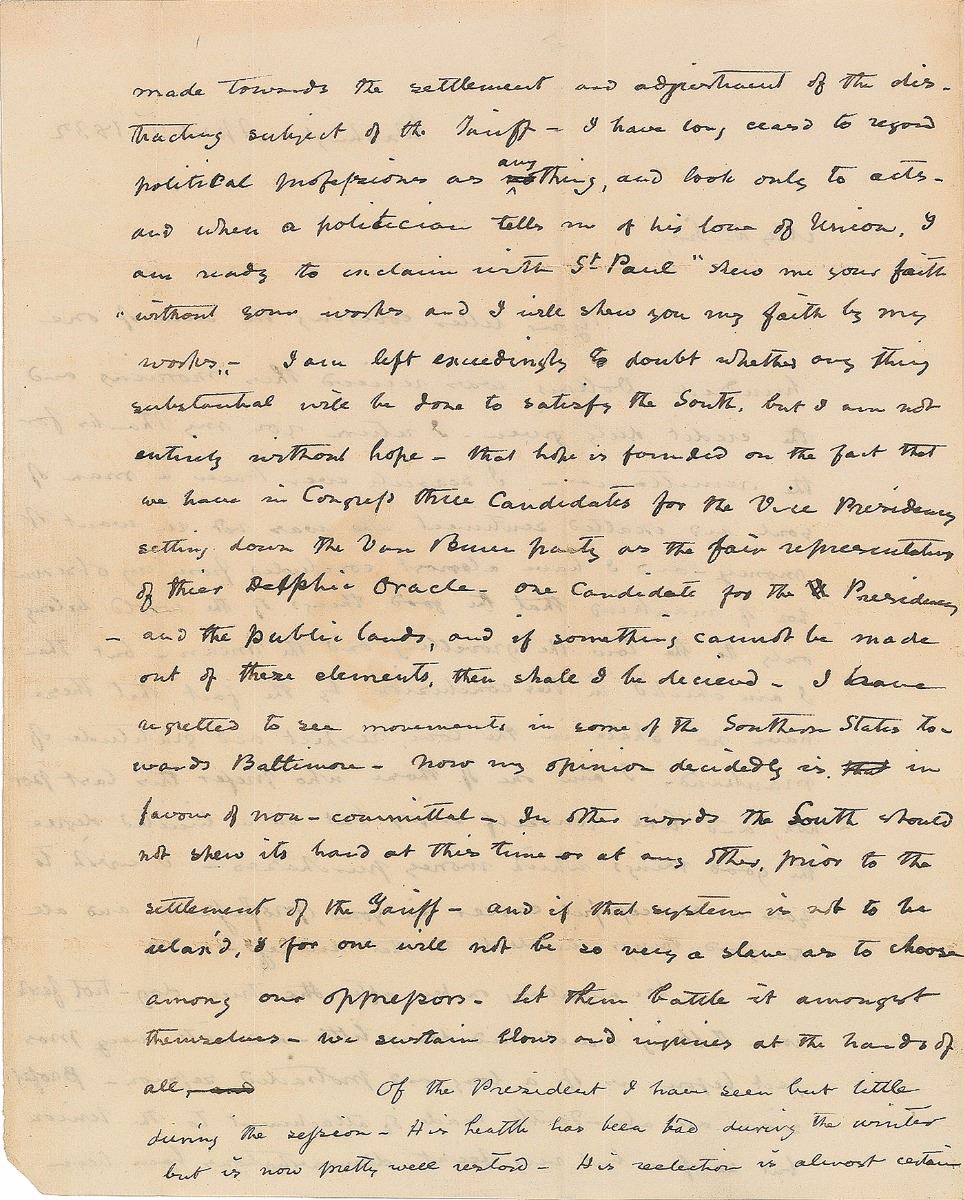 We are getting on here after the true dog-hot fashion, faltering much and doing little, and with every prospect before us of a long and protracted session. Professions are abundantly made of attachment to the Union but so far but very feint demonstrations have been made towards the settlement and adjustment of the distracting subject of the Tariff. I have long ceased to regard political professions as any thing, and look only to acts, and when a politician tells of his love of Union, I am ready to exclaim with St. Paul ‘show me your faith without your works and I will show you my faith by my works.’ I am left exceedingly to doubt whether any thing substantial will be done to satisfy the South, but I am not entirely without hope, that hope is founded on the fact that we have in Congress three Candidates for the Vice Presidency setting down the Van Buren party as the fair representatives of their Delphi Oracle. One candidate for the Presidency and the public lands, and if something cannot be made out of these elements, then shall I be deceived. I have regretted to see movements in some of the Southern States towards Baltimore. Now my opinion decidedly is in favor of non-committal. In other words the South should not shew its hand at this time or at any other, prior to the settlement of the Tariff…I for one will not be so very a slave as to choose among our oppressors. Let them battle it amongst themselves. We sustain blows and injuries at the hands of all.