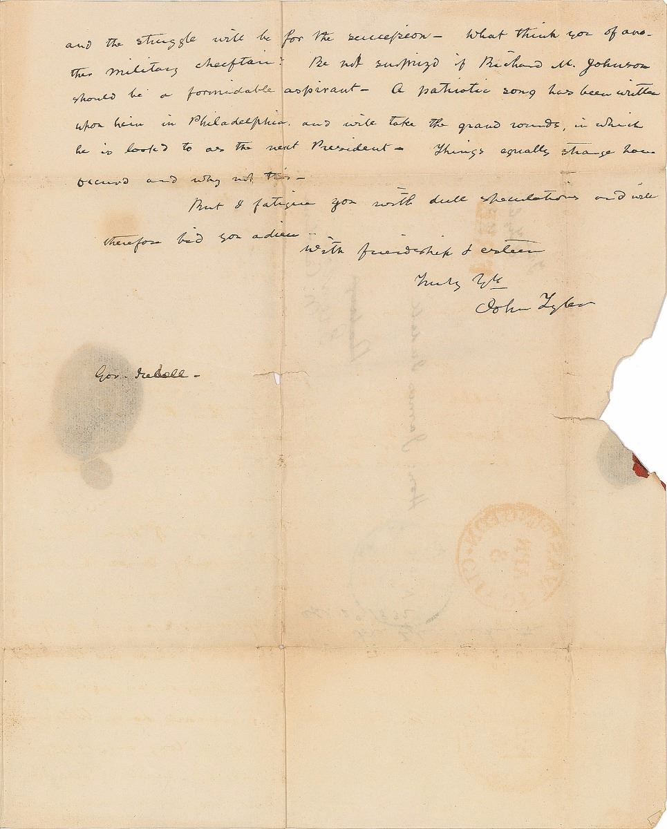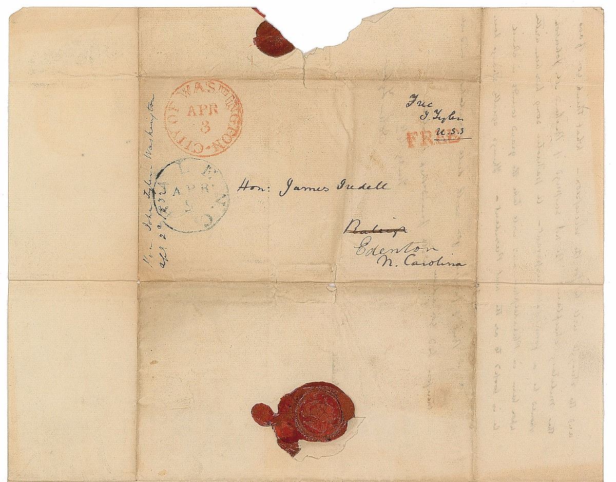 Of the President I have seen but little during the session. His health has been bad during the winter but is now pretty well rested. His reelection is almost certain and the struggle will be for the succession. What think you of another military chieftain. Be not surprized if Richard M. Johnson should be a formidable aspirant. A patriotic song has been written upon him in Philadelphia, and will take the grand rounds, in which he is looked to as the next President. Things equally strange have occurred and why not this.” Addressed on the reverse of the second integral page in Tyler’s hand to “Hon: James Iredell, Raleighm, N. Carolina,” and franked in the upper right, “Free, J. Tyler, U.S.S.” In fine condition, with small splits at fold intersections and some seal-related paper loss.
