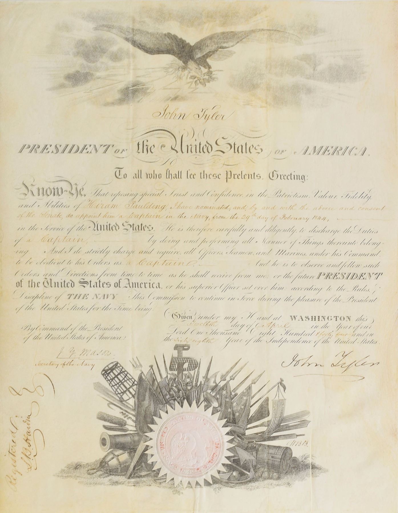 Partly-printed vellum DS as president, one page, 13.5 x 17.5, April 12, 1844. President Tyler appoints Hiram Paulding as "a Captain in the Navy." Signed at the conclusion by Tyler, and countersigned by John Y. Mason as secretary of the Navy. White naval department seal remains affixed to lower vignette. In fine condition. Paulding was a Rear Admiral in the United States Navy, who served from the War of 1812 until after the Civil War. After the war he served as governor of the Naval Asylum at Philadelphia and as post-admiral at Boston.