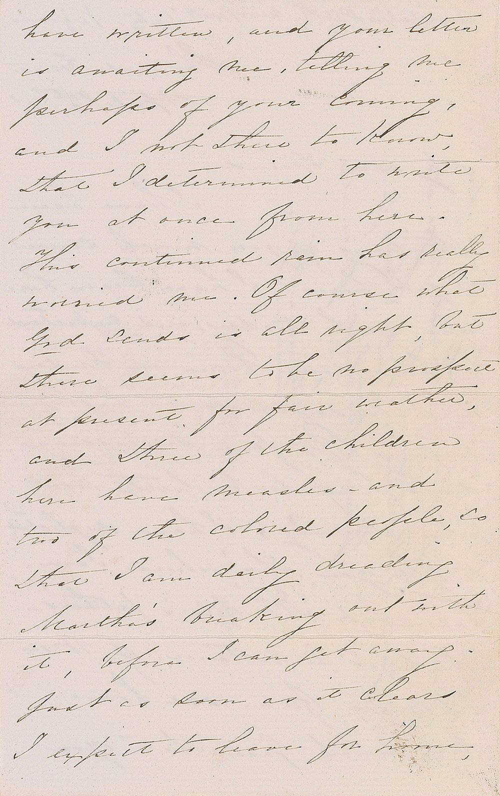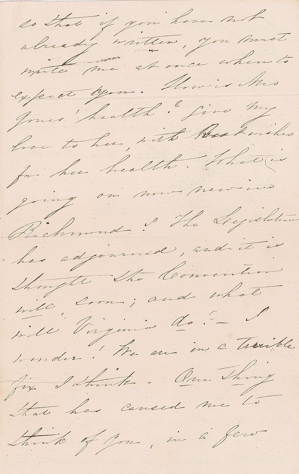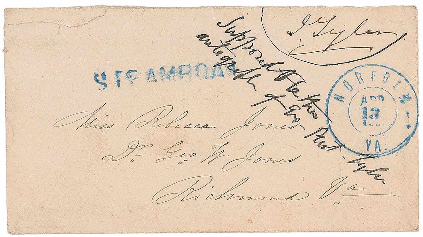Civil War-dated free franked mailing envelope, 4.25 x 2.5, franked in the upper right, “J. Tyler,” addressed in another hand to “Miss Rebecca Jones,” in Richmond, Virginia, and enclosing a partly cross-written ALS from his daughter-in-law, Nannie Bridges Tyler, two pages on both sides, 4.5 x 7, dated April 9, 1861. Nannie writes to a friend, Rebecca Jones, in Richmond. In part: “Three of the children here have measles and two of the colored people, so that I am daily dreading Martha’s breaking out with it, before I can get away…. That is going on more now in Richmond. The legislature has adjourned, and it is thought the Convention will, soon; and what will Virginia do? I wonder! We are in a terrible fix I think. One thing that has caused me to think of you, in a few days past is that I have been reading work on Spiritualism. Don’t you remember my alarm at your communications. Certainly there are wonderful things told—wonderful revelations made, but I am skeptical. God’s word is sufficient.” In fine condition, with a few tiny opening tears, early ink annotation, and a subtle touch of soiling to envelope, none of the above affecting the clear, dark signature. The envelope bears a steamship postmark of April 13, one day following Beauregard’s attack against Fort Sumter—the opening salvo of what would prove to be the bloodiest war in American history.