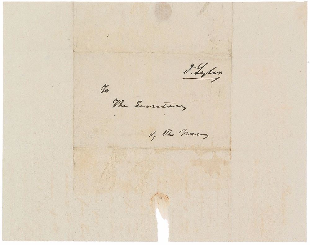 Full free frank (presumably as president), measuring 10 x 7.75 unfolded with a center panel of 5.25 x 3.25, addressed by Tyler, "To The Secretary of the Navy," and franked in the upper right, "J. Tyler." In fine condition.