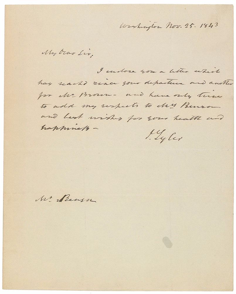 Boldly penned ALS as president signed "J. Tyler," one page, 8 x 10, November 25, 1843. Letter to Mr. Benson. In full: "I enclose you a letter which has reached since your departure and another for Mr. Brown, and have only time to add my respects to Mrs. Benson and best wishes for your health and happiness." In fine condition, with intersecting folds (one vertical fold passing through a single letter of the signature); an exceptionally clean, appealing example.