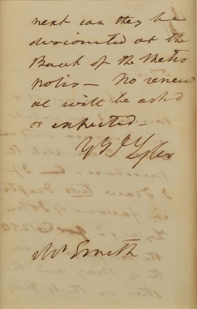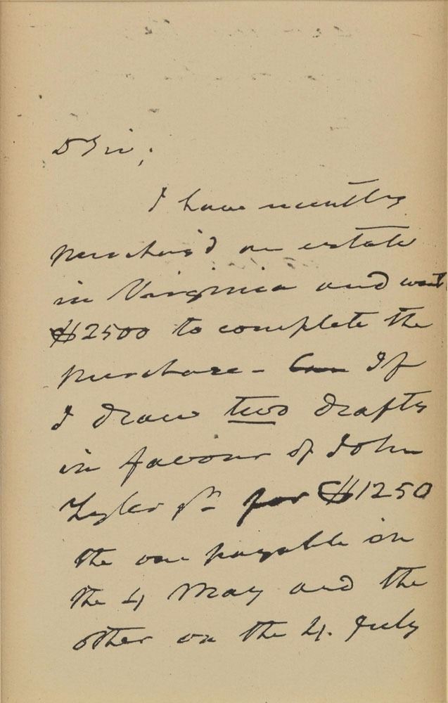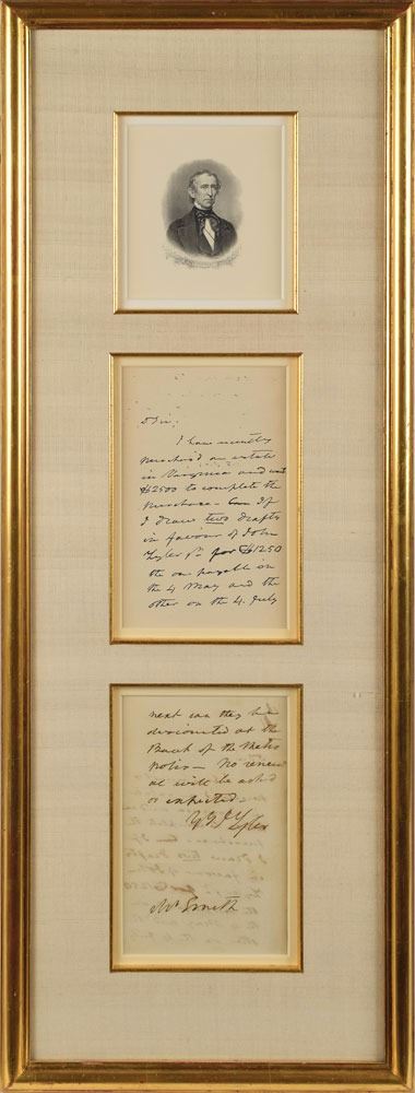 ALS signed “Yrs, J. Tyler,” one page both sides, 4.25 x 6.75, no date. In full: "I have recently purchas'd an estate in Virginia and want $2500 to complete the purchase—If I draw two drafts in favour of John Tyler for $1250 the one payable on the 4 May and the other on the 4 July next can they be discounted at the Bank of the Metropolis—no renewal will be asked or expected." Double-matted and framed with a copy of the front side and an engraving of Tyler to an overall size of 10.75 x 28.25. In fine condition, with writing showing through from opposing sides.