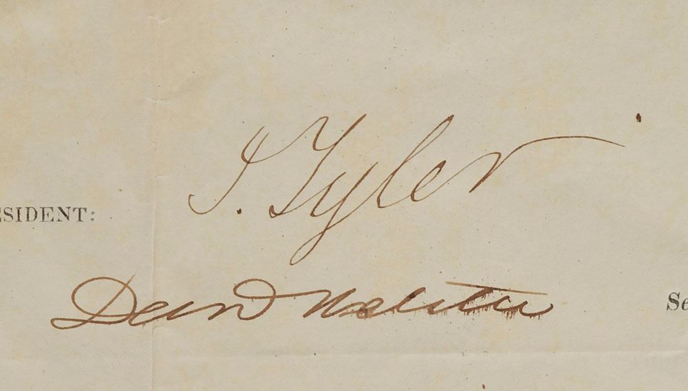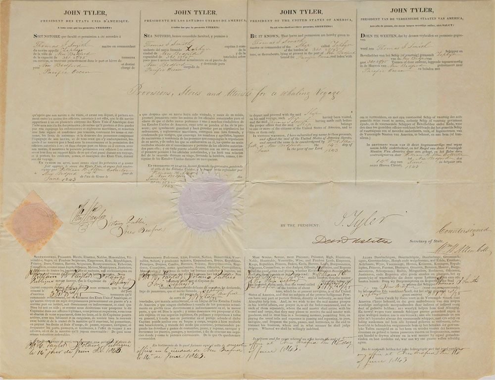 Partly-printed DS as president, signed “J. Tyler,” one page, 20.75 x 16, June 14, 1843. Four-language ship’s paper issued to "Thomas F. Smith, master or commander of the Ship called Zephyr…lying at present in the port of New Bedford, bound for Pacific Ocean and laden with Provisions, Stores and Utensils for a whaling voyage." Prominently signed in the center by President Tyler and countersigned by Secretary of State Daniel Webster. The white paper seal affixed at the center remains fully intact. In fine condition, with a couple of small tears to the bottom edge, and light toning to the side edges.