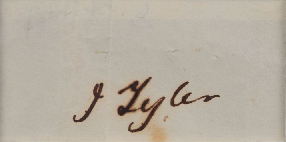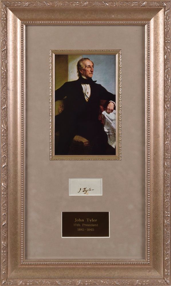 Bold ink signature, "J. Tyler,” on an off-white 2.75 x 1.25 slip. Handsomely suede-matted and framed with a plaque and portrait to an overall size of 14 x 23.5. In fine condition.