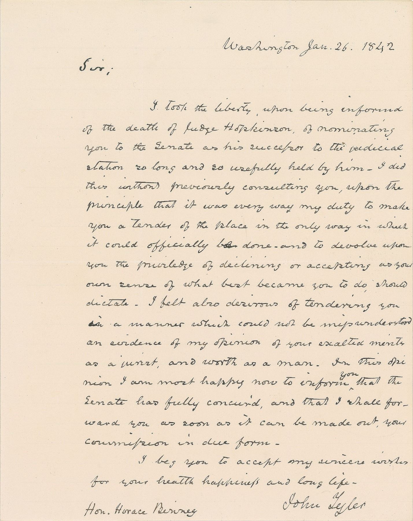 ALS as president, one page, 8 x 10, January 26, 1842. Letter to prominent Philadelphia lawyer Horace Binney, in full: "I took the liberty, on being informed of the death of Judge Hopkinson, of nominating you to the Senate as his successor to the judicial station so long and so usefully held by him. I did this without previously consulting you, upon the principle that it was every way my duty to make you a tender of the place in the only way in which it could officially be done—and to devolve upon you the privilege of declining or accepting as your own sense of what best became you to do so, should dictate. I felt also desirous of tendering you in a manner which could not be misunderstood on evidence of my own opinion of your exalted merits as a jurist, and worth as a man. In this opinion I am most happy now to inform you that the Senate has fully concur'd, and that I shall forward you as soon as it can be made out, your commission in due form. I beg you to accept my sincere wishes for your health happiness and long life." In fine condition.