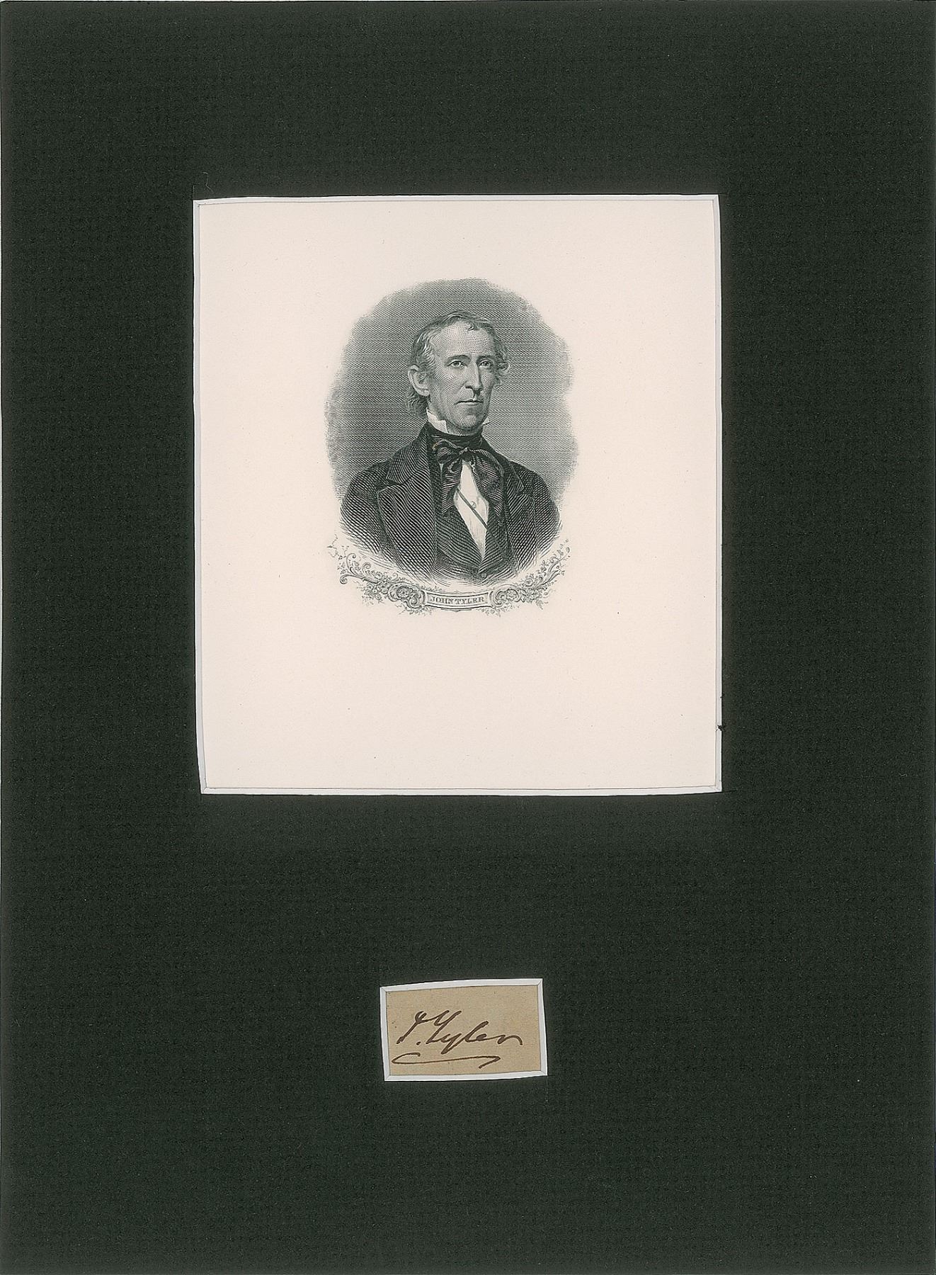 Ink signature, "J. Tyler,” on an off-white 1.25 x .75 slip. Matted with an engraved portrait to an overall size of 8 x 11. In fine condition.