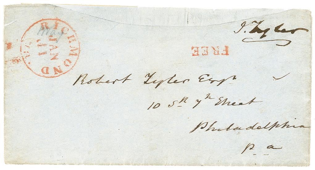 Partial free frank, 11.75 x 6.25, folded to a size of 6.25 x 3.25, addressed in Tyler’s hand to “Robert Tyler, Esq., 10 Sw. 7th Street, Philadelphia, PA,” and franked on the upper right corner, “J. Tyler.” Scattered toning and creasing, and some light pooling of ink to franking signature, otherwise fine condition as folded.