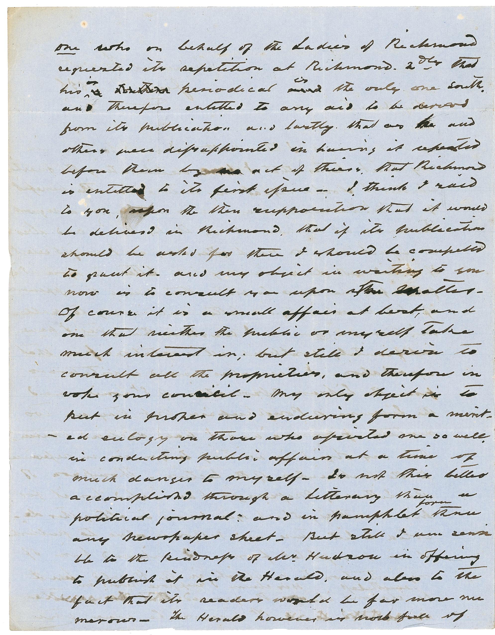 My only object is to put in proper and enduring form a merited eulogy on those who assisted me so well in conducting public affairs at a time of much danger to myself. Is not this better accomplished through a litterary [sic] than a political journal? and in pamphlet form than any newspaper sheet – But still I am sensible to the kindness of Mr. Hudson in offering to publish it in the Herald, and also to the fact that its readers would be far more numerous – The Herald however is most full of interesting political incident which the southern periodical has to look to its contributors for aid. If then the Herald has space for it now, amid the stirring events of the day, would Mr Hudson object to transferring it from the paper of the Messenger in advance of the other political papers – If he would not, I would require Thompson to forward at the instant of issue, a copy to the Herald so as to ensure that point – Please write me without delay.