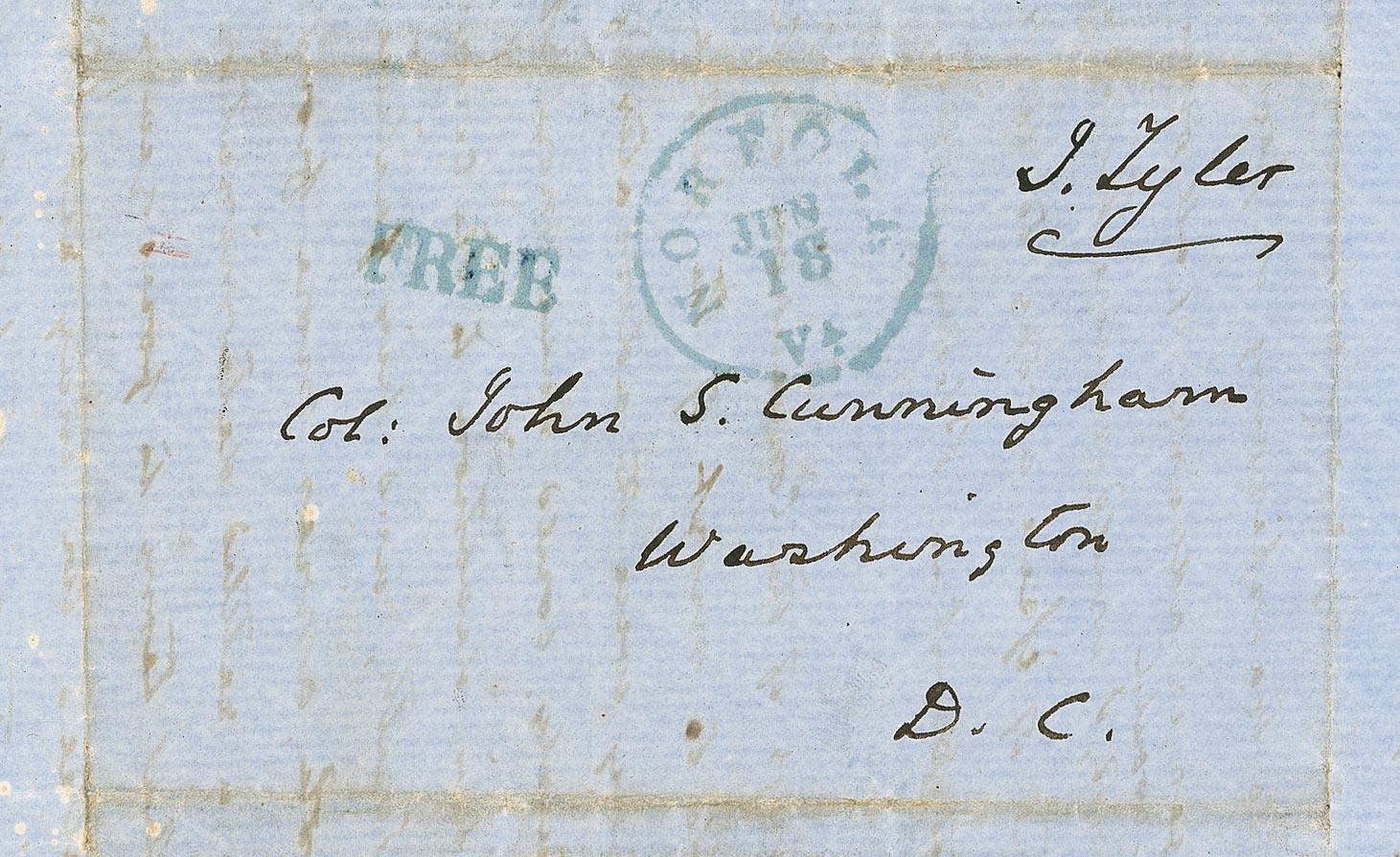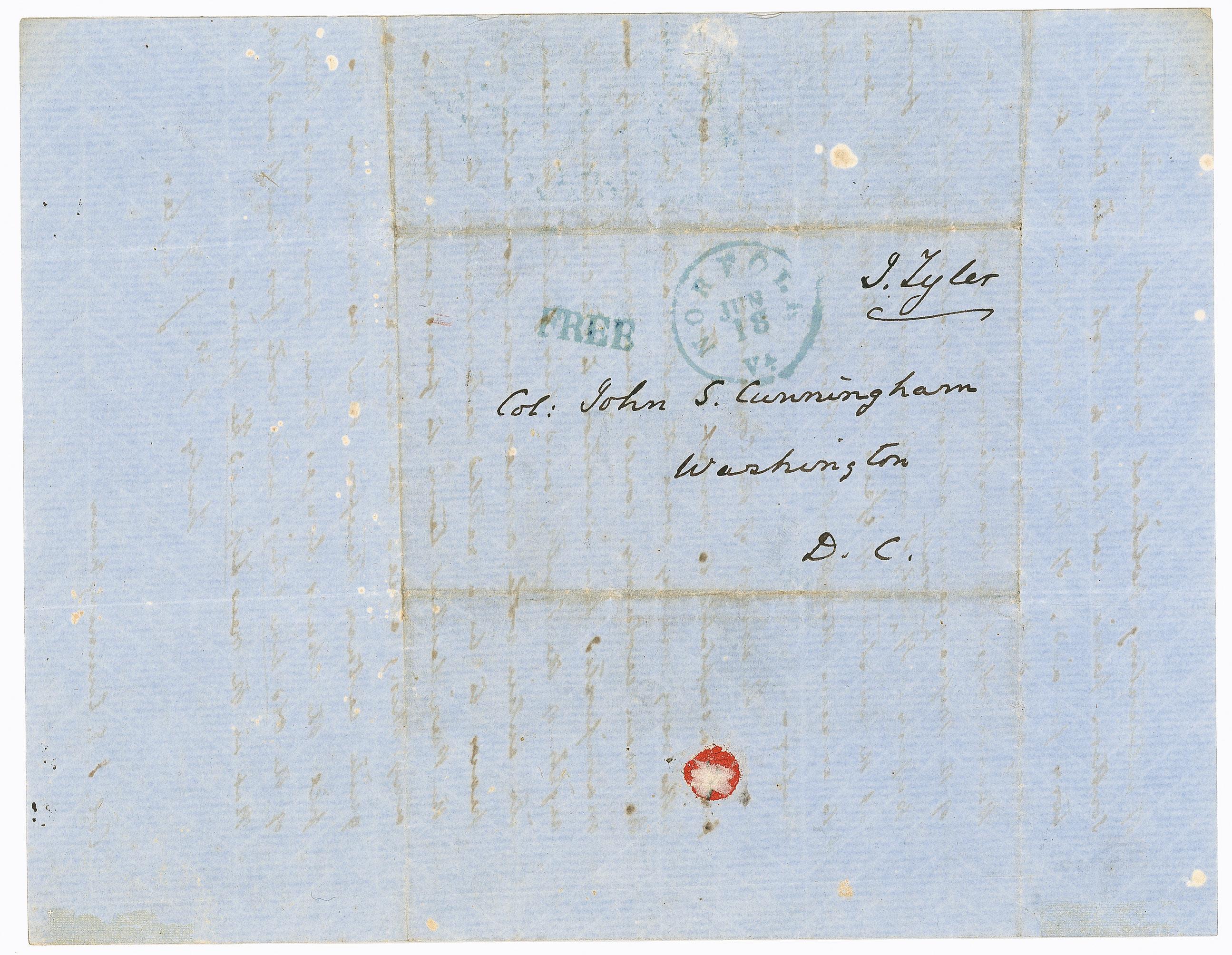 Reverse of second page bears an addressed panel in Tyler’s hand to “Col. John S. Cunningham, Washington, D.C.,” free-franked in the upper right, “J. Tyler,” and bearing a “Free” stamp and a June 18, Norfolk cancellation.