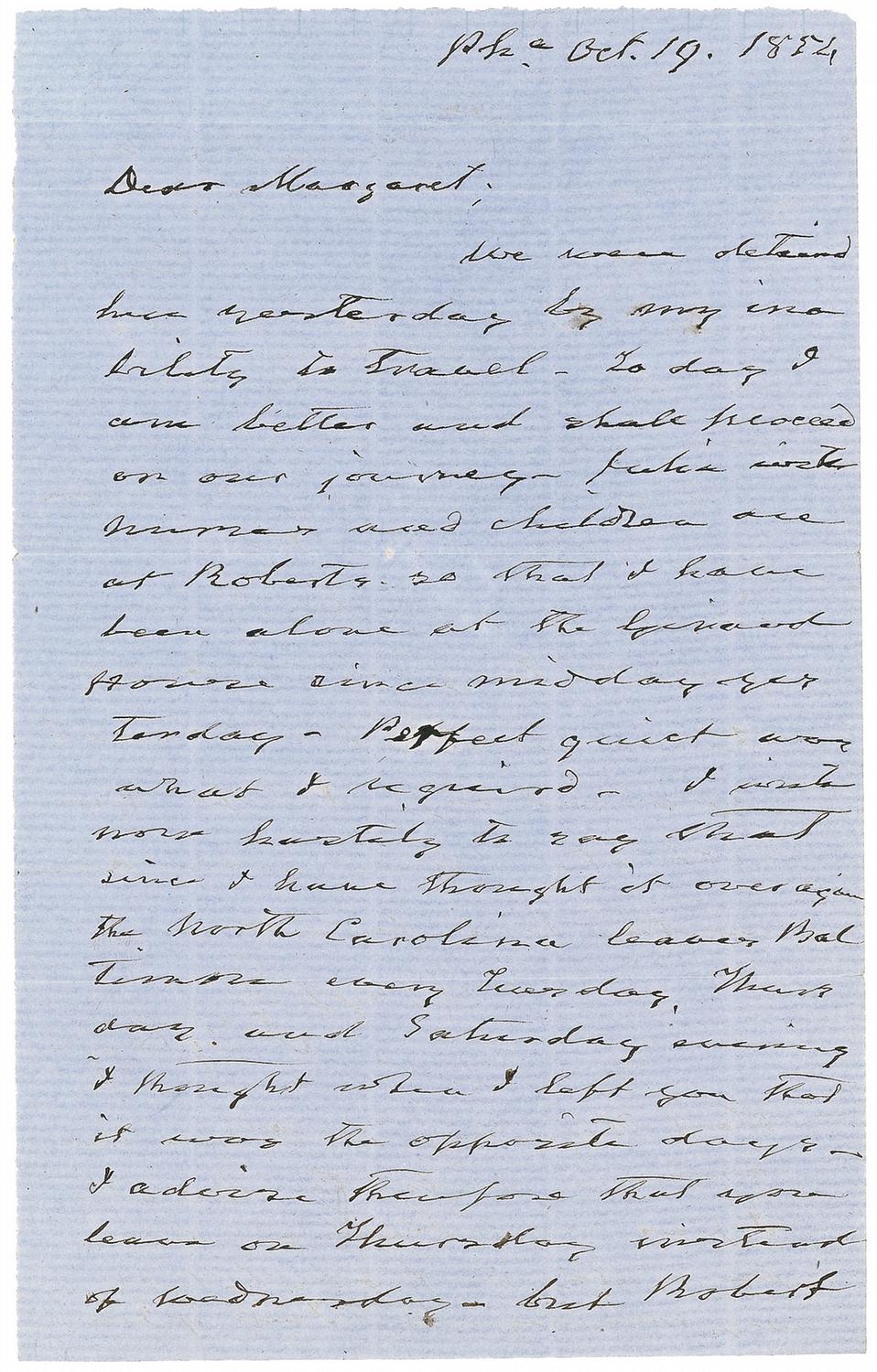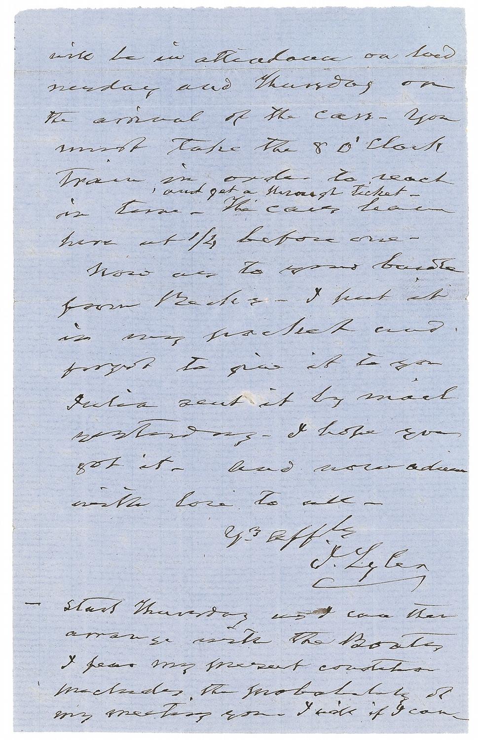 ALS signed “J. Tyler,” one page both sides, 5 x 8, October 19, 1854. Letter addressed to Margaret. In part: “We were detained here yesterday by my inability to travel. Today I am better and shall proceed on our journey…I have been alone at the…house since midday yesterday. Perfect quiet was what I required. I write most hastily to say that since I have thought it over again the North Carolina leaves Baltimore every Tuesday, Thursday, and Saturday evening…I advice therefore that you leave on Thursday…but Robert will be in attendance on Wednesday and Thursday on the arrival of the cards…Now as to your bundle from Becker—I put it in my pocket and forgot to give it to you. Julia sent it by mail yesterday.” Tyler also adds a short postscript reading, in part: “I fear my present condition precludes the probability of my meeting you. I will if I can.” In fine condition, with a bit of scattered light toning and soiling.