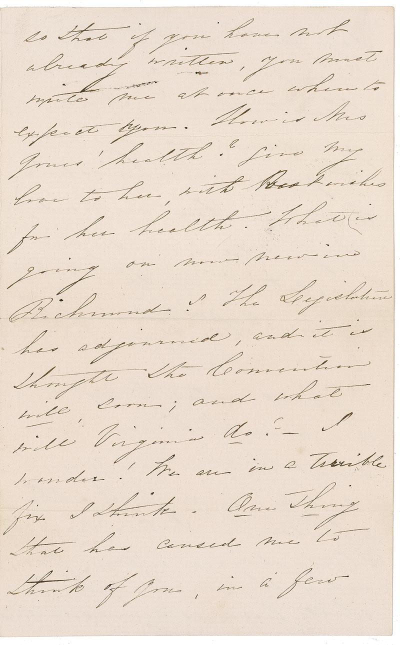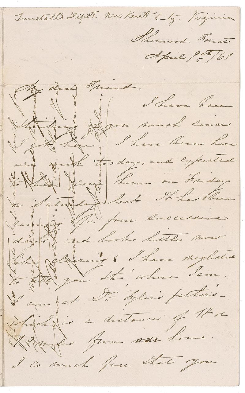 Free franked 4.25 x 2.5 mailing envelope, addressed in another hand to “Miss Rebecca Jones,” in Richmond, Virginia, franked in the upper right, “J. Tyler,” enclosing a partly cross-written ALS from his daughter-in-law, Nannie Bridges Tyler, two pages on both sides, 4.5 x 7, dated April 9, 1861. Nannie writes to a friend, Rebecca Jones, in Richmond. In part: “Three of the children here have measles and two of the colored people, so that I am daily dreading Martha’s breaking out with it, before I can get away…. That is going on more now in Richmond. The legislature has adjourned, and it is thought the Convention will, soon; and what will Virginia do? I wonder! We are in a terrible fix I think. One thing that has caused me to think of you, in a few days past is that I have been reading work on Spiritualism. Don’t you remember my alarm at your communications. Certainly there are wonderful things told—wonderful revelations made, but I am skeptical. God’s word is sufficient.” In fine condition, with a few tiny opening tears, early ink annotation, and a subtle touch of soiling to envelope, none of the above affecting the clear, dark signature. The envelope bears a steamship postmark of April 13, one day following Beauregard’s attack against Fort Sumter—the opening salvo of what would prove to be the bloodiest war in American history.