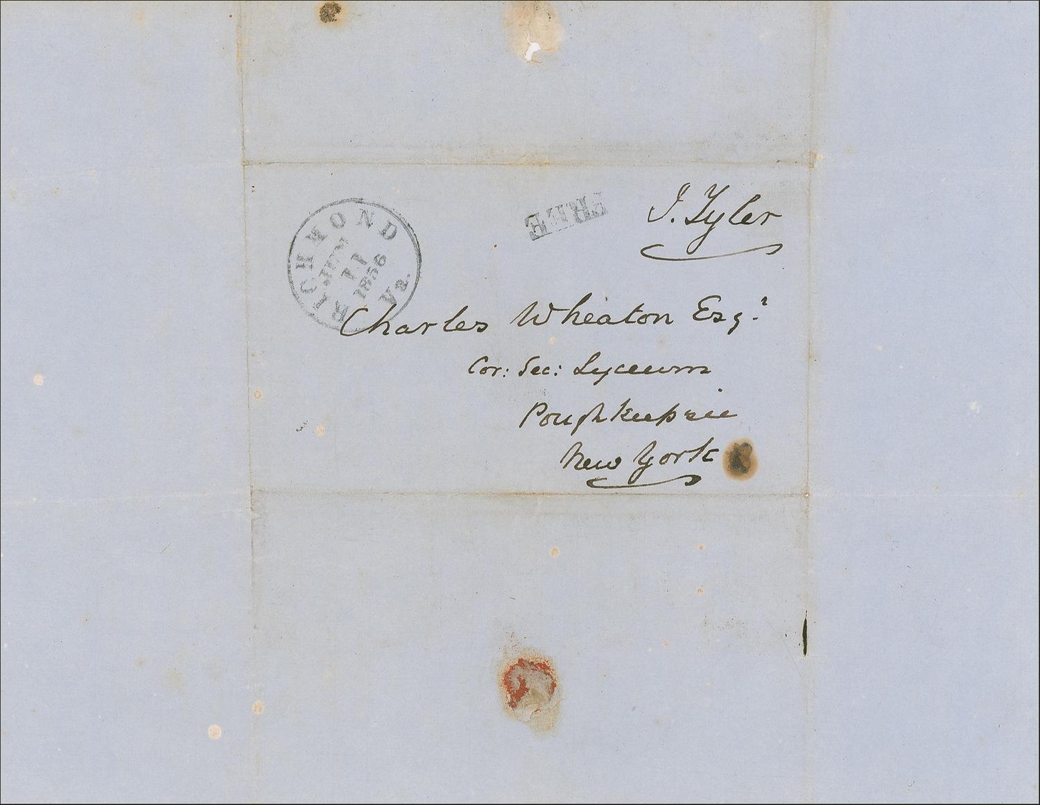 Full free frank, measuring 10 x 7.75 unfolded, with franked panel measuring 5.5 x 3.25, addressed in Tyler’s hand to “Charles Wheaton, Esqr. Cor: Sec: Lyceum, Poughkeepsie, New Yotk,” and stamped “Free,” and franked in the upper right, “J. Tyler.” Panel also bears a June 11, 1856, Richmond, Virginia postal cancellation. Small area of toning and soiling to bottom of address panel, some other scattered light toning, and expected folds, otherwise fine condition.