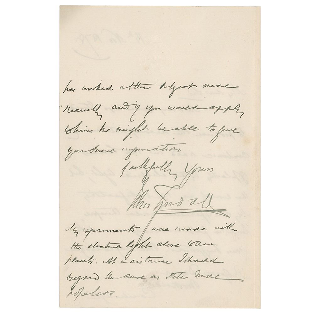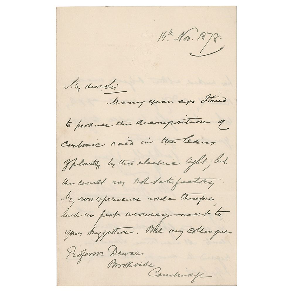 Irish physicist (1820-1893) known for his study of diamagnetism and his realms of infrared radiation and the physical properties of air. ALS, one page both sides, 4.5 x 7, November 14, 1878. Handwritten letter referencing noted physicist James Dewar, in part: "Many years ago I tried to produce the decomposition of carbonic acid in the leaves of plants by the electric light, but the result was not satisfactory… But my colleague, Professor Dewar, Brookside, Cambridge, has worked on the object more recently and if you would apply to him he might be able to give you some information." In fine condition.