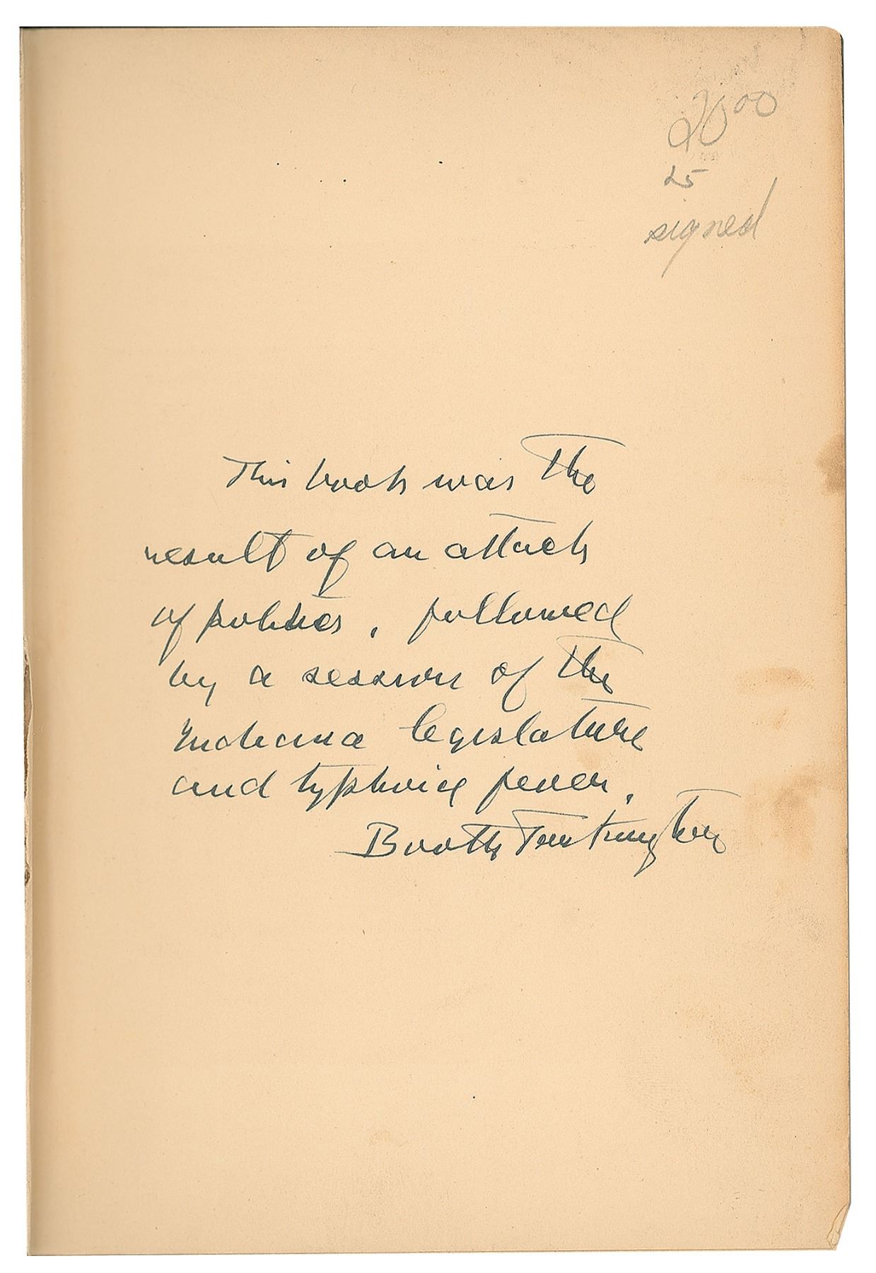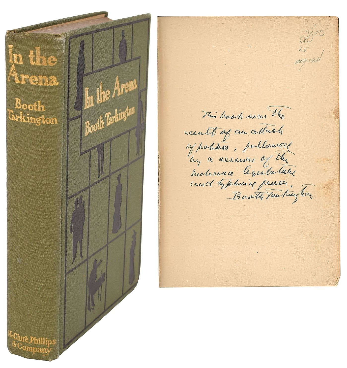 Signed book: In the Arena by Booth Tarkington. Second printing. NY: McClure, Phillips & Co., 1905. Hardcover, 5.5 x 7.75, 276 pages. Signed on the first free end page in fountain pen, "This book was the result of an attack of politics, followed by a session of the Indiana legislature and typhoid fever. Booth Tarkington." In very good to fine condition, with light stains to the signed page, light sunning to the spine, and partial cracking to the front inner hinge. In 1902, Tarkington served one term in the Indiana House of Representatives as a Republican, an experience from which he drew inspiration for some of the political short stories in this volume.