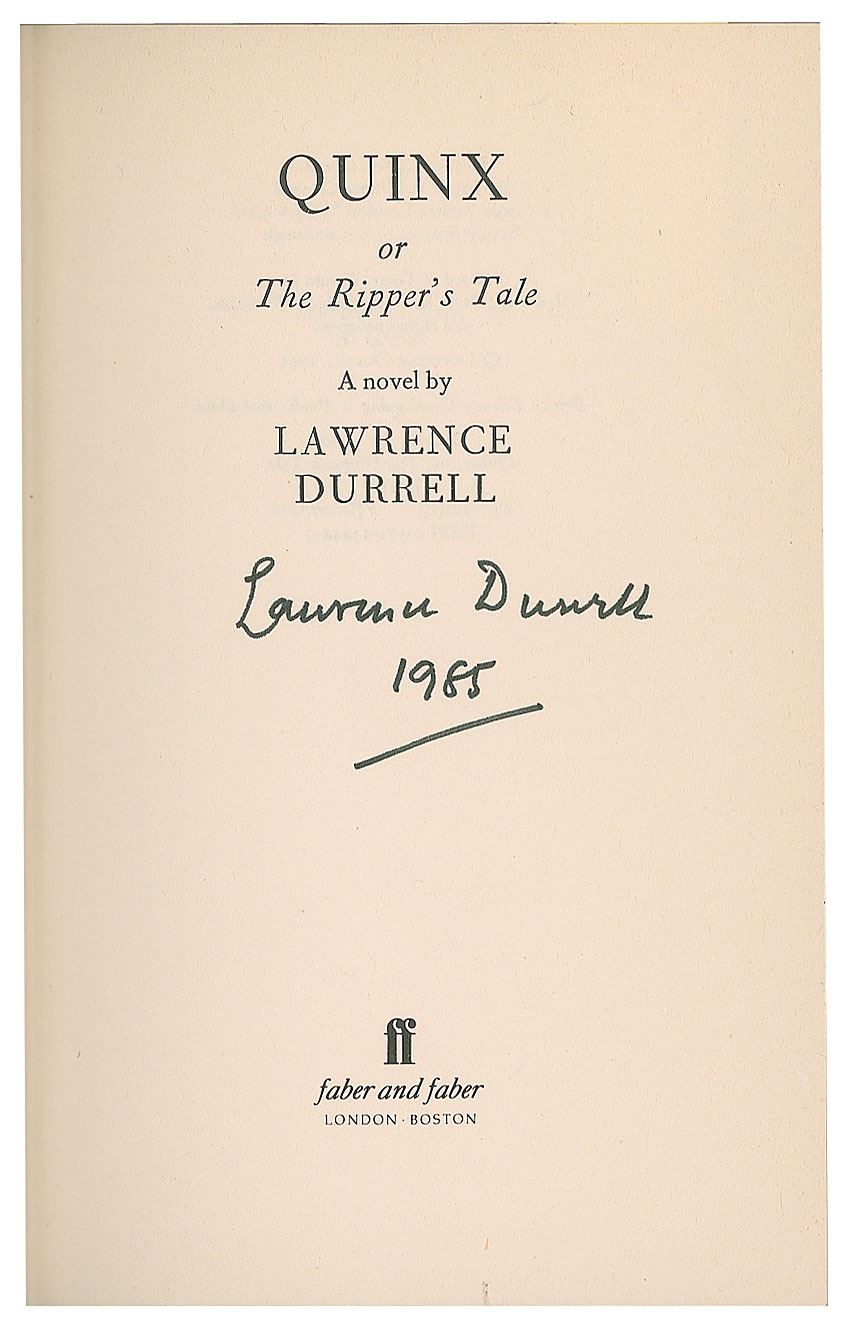 Signed book: Quinx, or The Ripper's Tale by Lawrence Durrell. First edition. London: Faber and Faber, 1985. Hardcover with dust jacket, 5.25 x 8, 201 pages. Signed on the title page in black felt tip, "Lawrence Durrell, 1985." In fine condition. This was the final installment in Durrell's 'quincunx' of novels, The Avignon Quintet, published from 1974 to 1985.