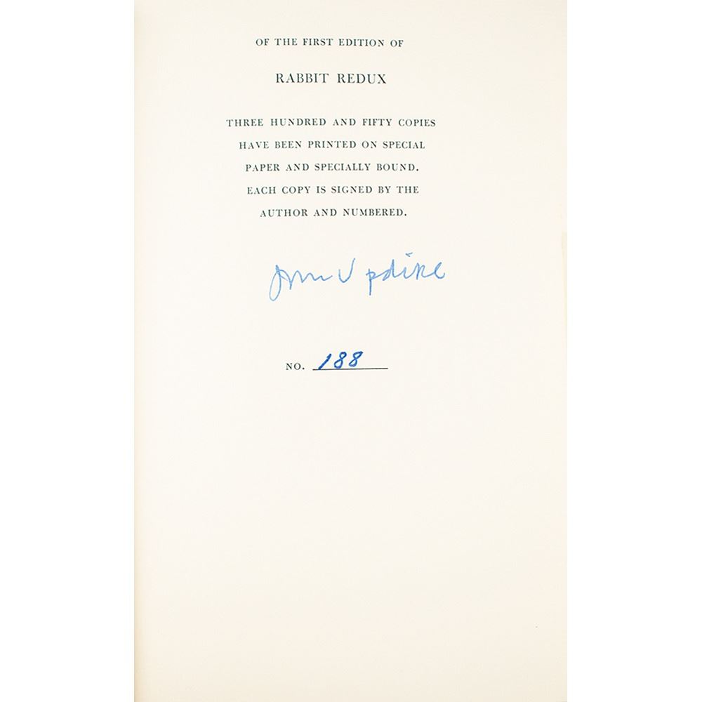 Signed book: Rabbit Redux. First edition, limited issue, numbered 188/350. NY: Alfred A. Knopf, 1971. Hardcover with slipcase, 5.75 x 8.25, 407 pages. Signed on the colophon in blue ink by John Updike. In fine condition.