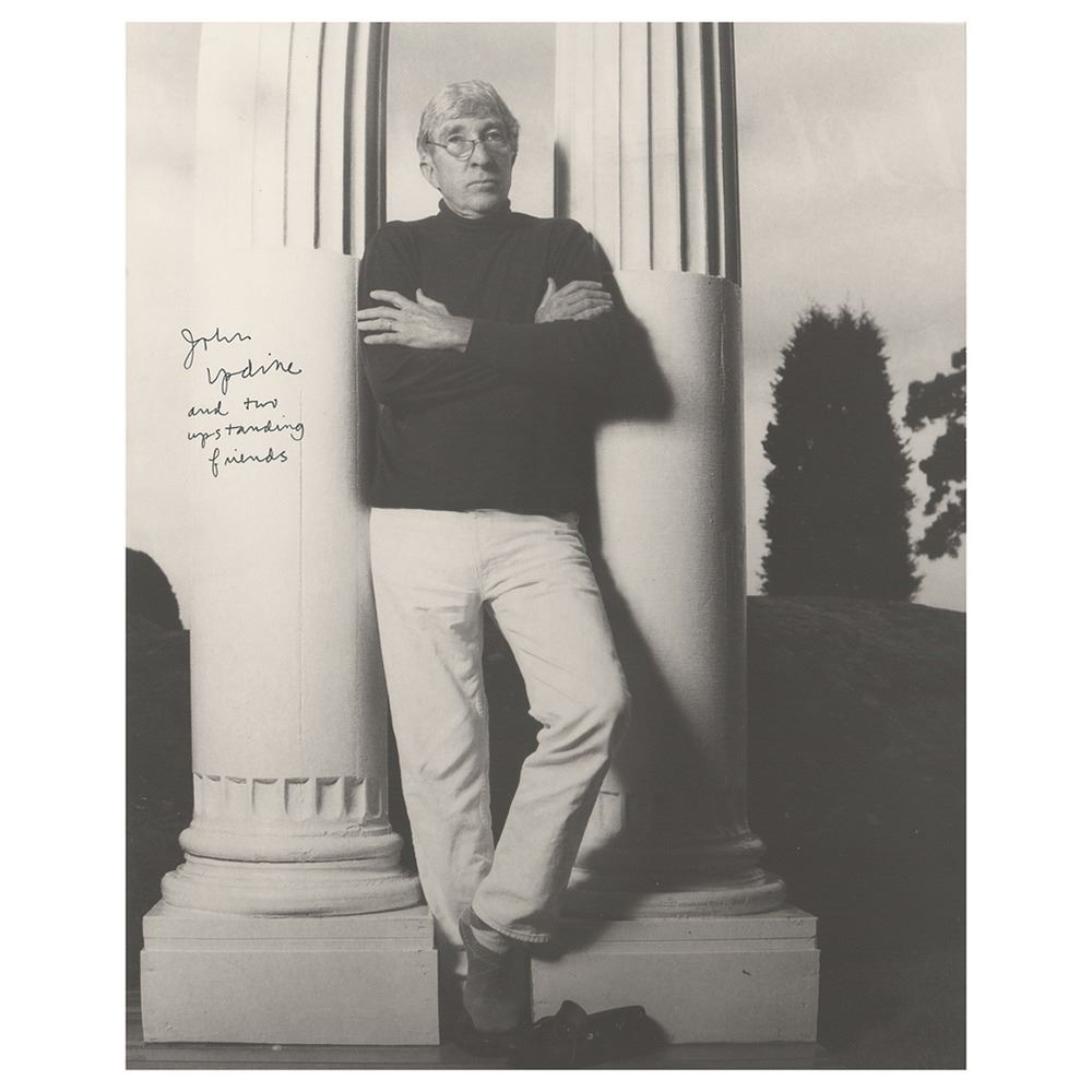 Oversized matte-finish 10.75 x 13.5 full-length photo of Updike posing in front of two large pillars, signed in black felt tip, "John Updike and two upstanding friends." In fine condition. Uncommon in portraits of this size.