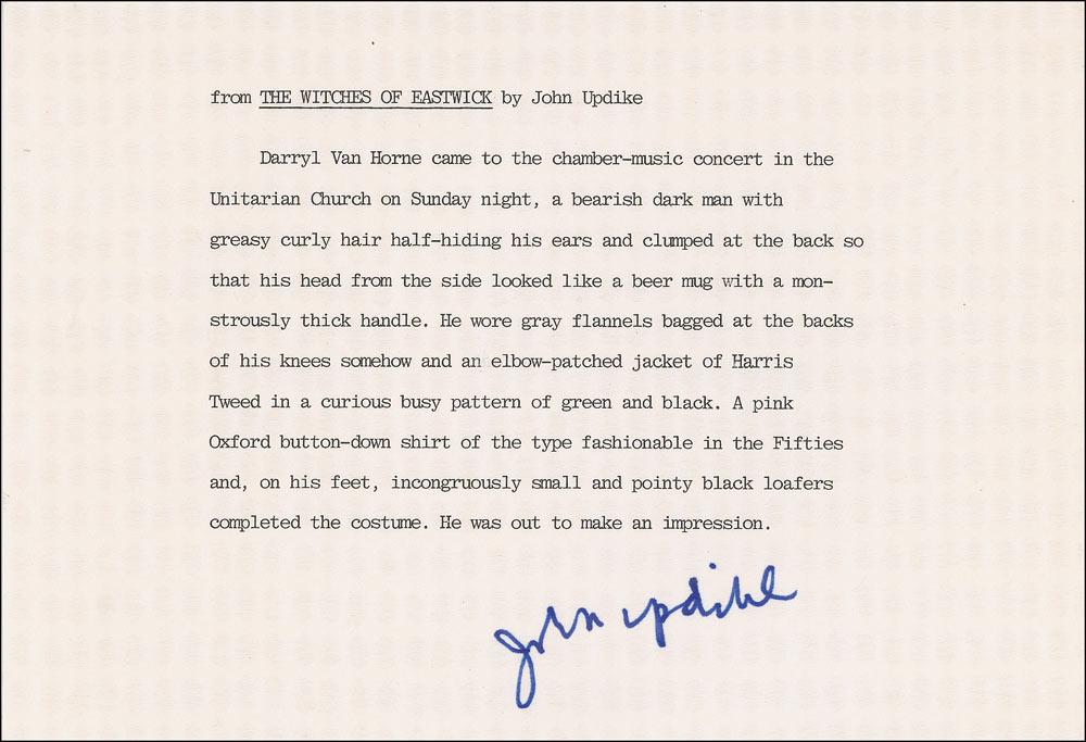 Souvenir typescript on a 9 x 6.25 light gray sheet, signed at the conclusion in blue felt tip by Updike. A paragraph from The Witches of Eastwick that begins, “Darryl Van Horne came to the chamber-music concert in the Unitarian Church on Sunday night, a bearish dark man with greasy curly hair half-hiding his ears and clumped at the back so that his head from the side looked like a beer mug with a monstrously thick handle.” In fine condition with a crease to the lower right corner.