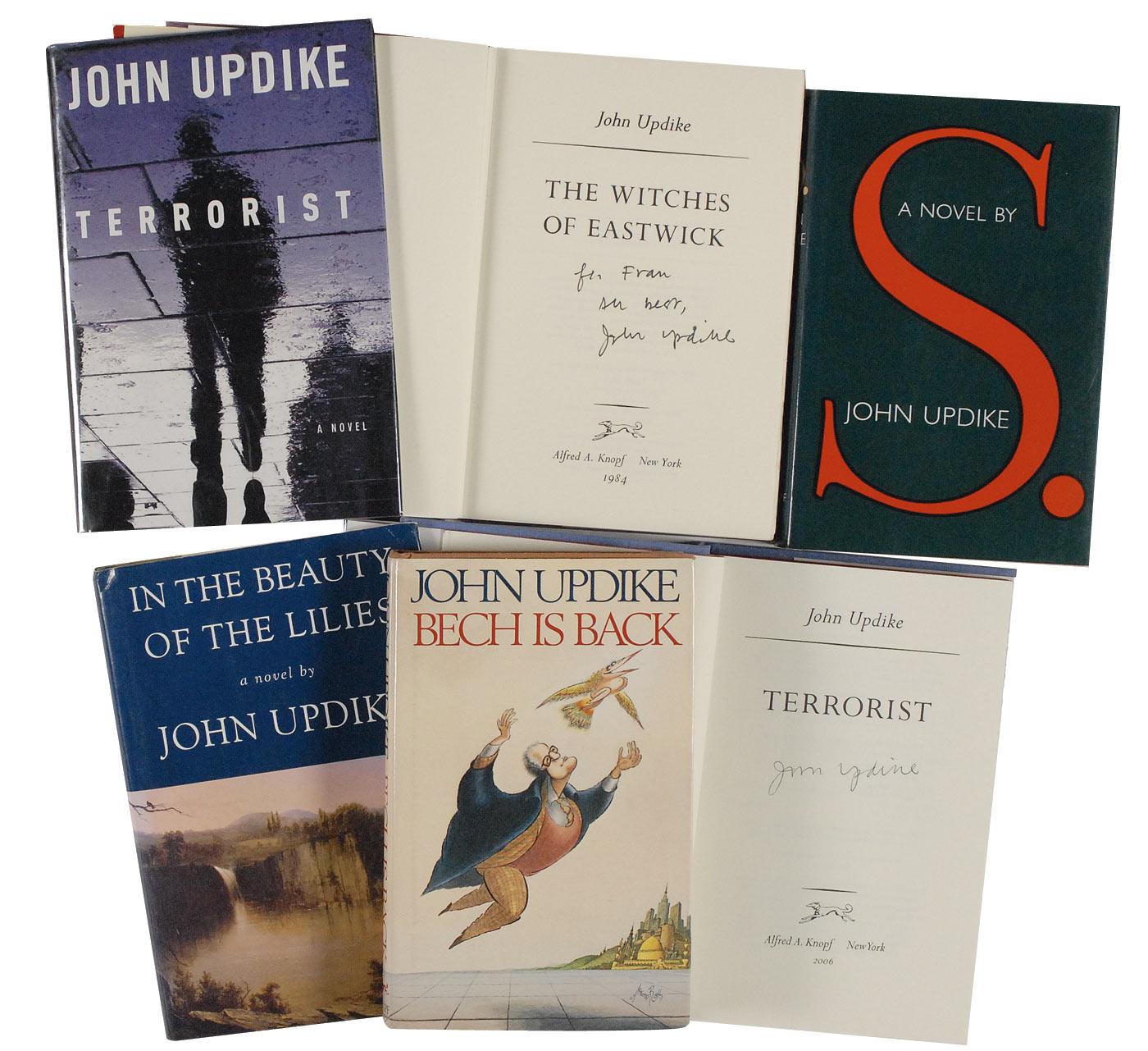 Six hardcover books, all with dustjackets. Titles signed on the title page are: Terrorist (2), In the Beauty of the Lilies (ins), and The Witches of Eastwick (ins), Bech Is Back signed on the half-title page, and S. signed on a bookplate affixed to the first free end page. In fine condition, with scattered light wear to dustjackets.