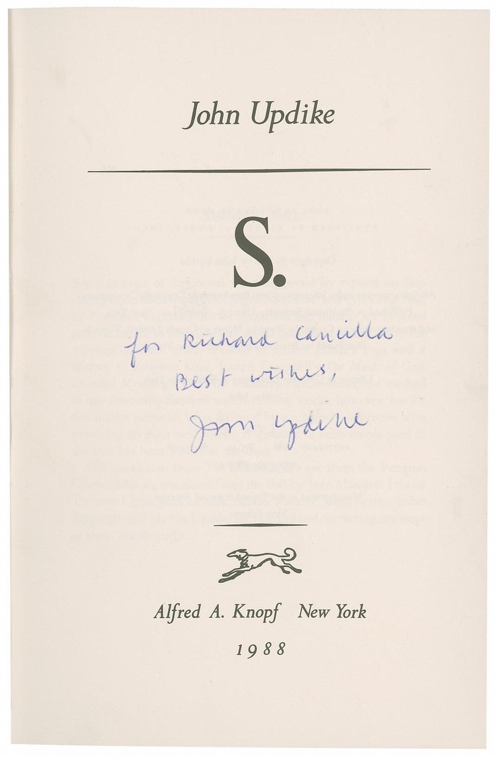Signed book: S. First edition, first printing. NY: Alfred A. Knopf, 1988. Hardcover with dustjacket, 5.5 x 8.25, 279 pages. Signed and inscribed on the title page, “For Richard Cancilla, Best Wishes, John Updike.” In fine condition, with light wear and a few tiny tears to the dustjacket.