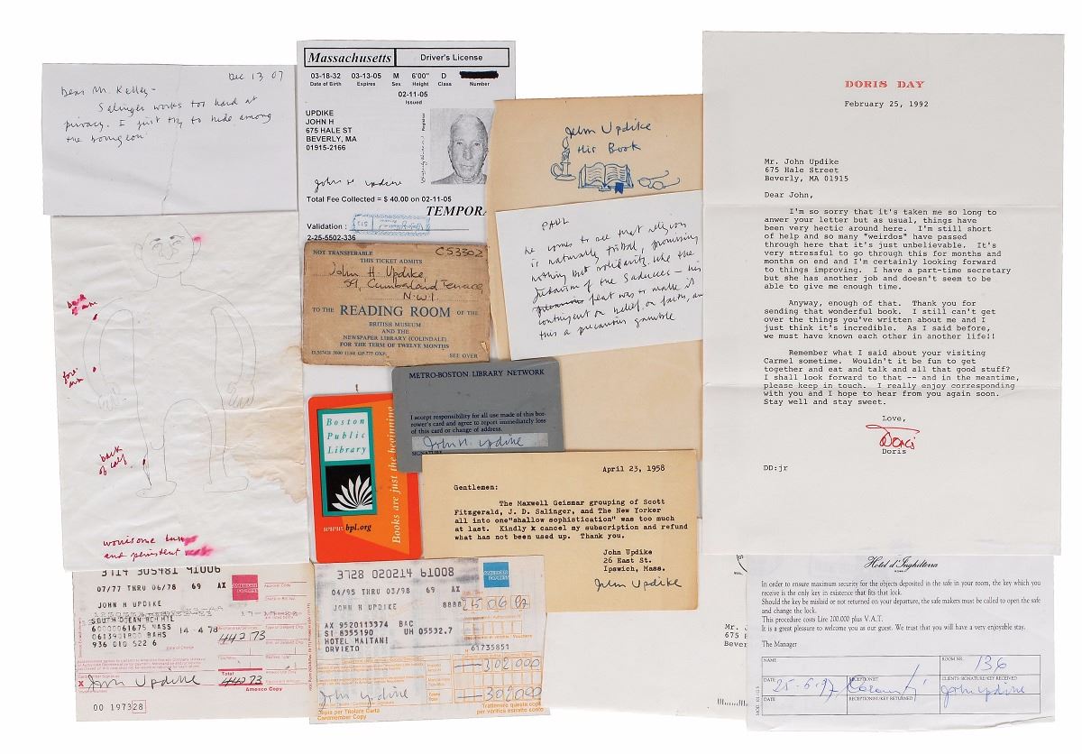 Nineteen golf scorecards, most with notes in Updike’s hand. A series of intimate love letters from “Joan.” Two notes mentioning Salinger: one handwritten and unsigned, and one typed and signed by Updike. Two of Updike’s library cards for the Boston Public Library, both signed on the reverse, and his signed ticket for access to the reading room of the British Museum. Two TLSs to Updike from Doris Day.