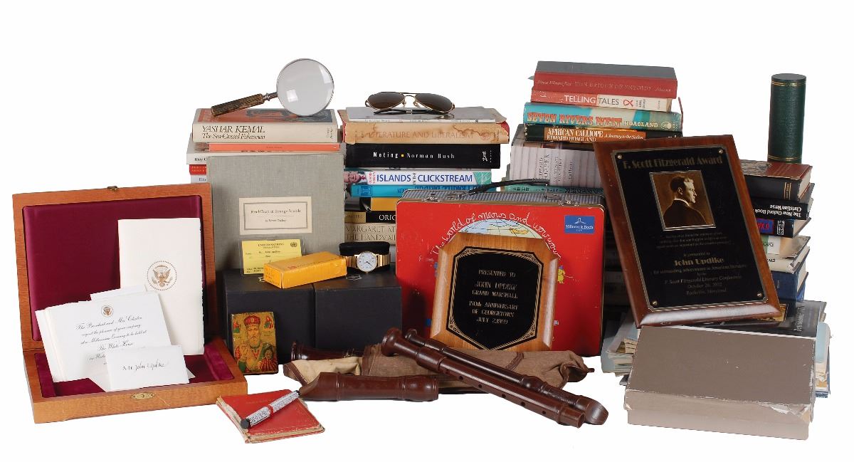 Some items from Updike’s wardrobe, including a pair of shoes and a few shirts, and countless knickknacks including a few recorders (the flute-like musical instrument), golf balls, playing cards, ceramic tiles and figurines, sunglasses, bottles, a shaving brush, a wristwatch, and two award plaques. In overall very good to fine condition. All together, this collection offers a fascinating behind-the-scenes look at the everyday life of an icon in American literature—and is a fitting tribute to the realist who described his style as an attempt ‘to give the mundane its beautiful due.’