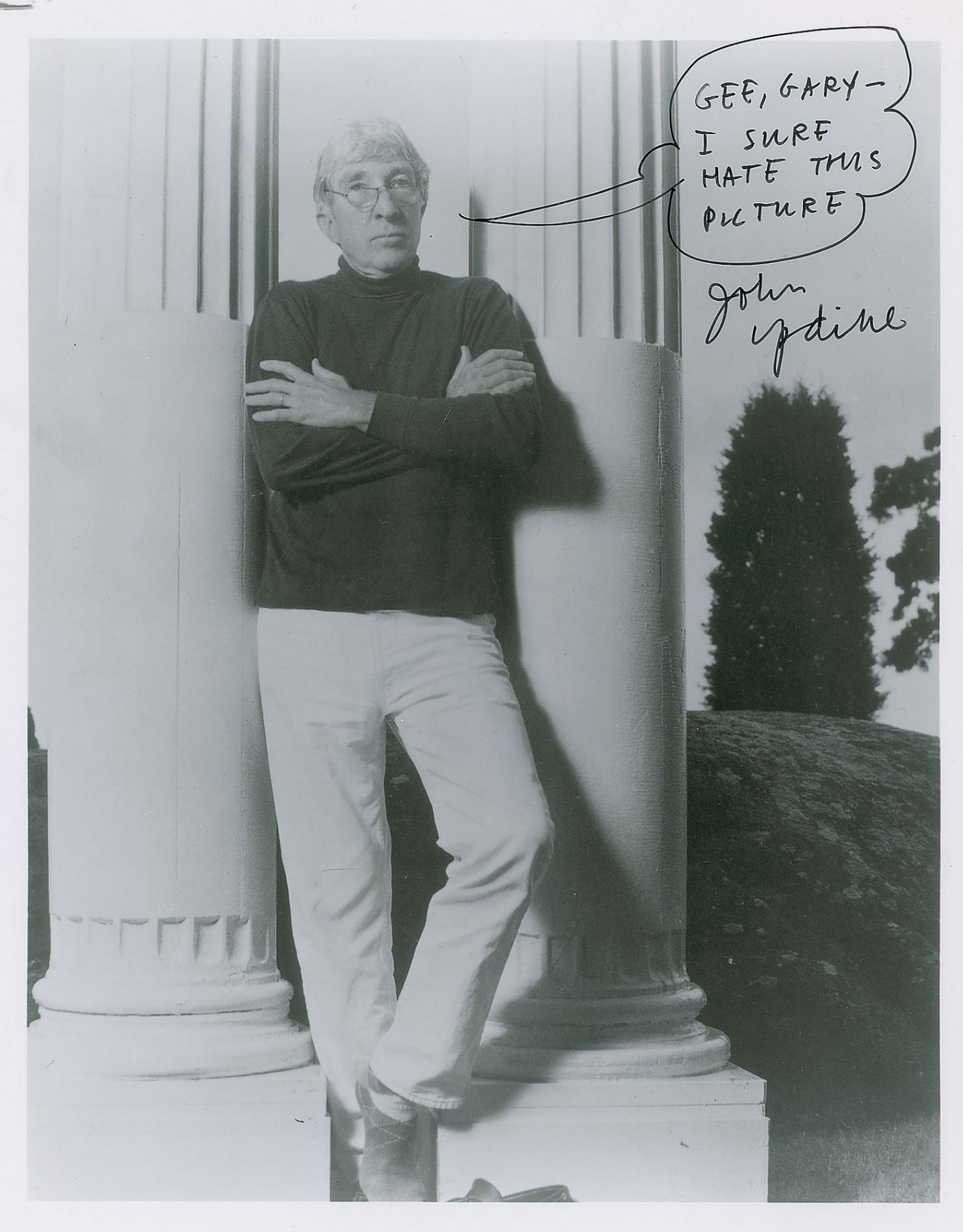 Glossy 8 x 10.25 photo of the three-time Pulitzer Prize-winning novelist posing against a pair of columns, signed in black ink by John Updike, who adds an inscription in a speech bubble: "Gee, Gary—I sure hate this picture.” In fine condition, with a couple of small surface creases.