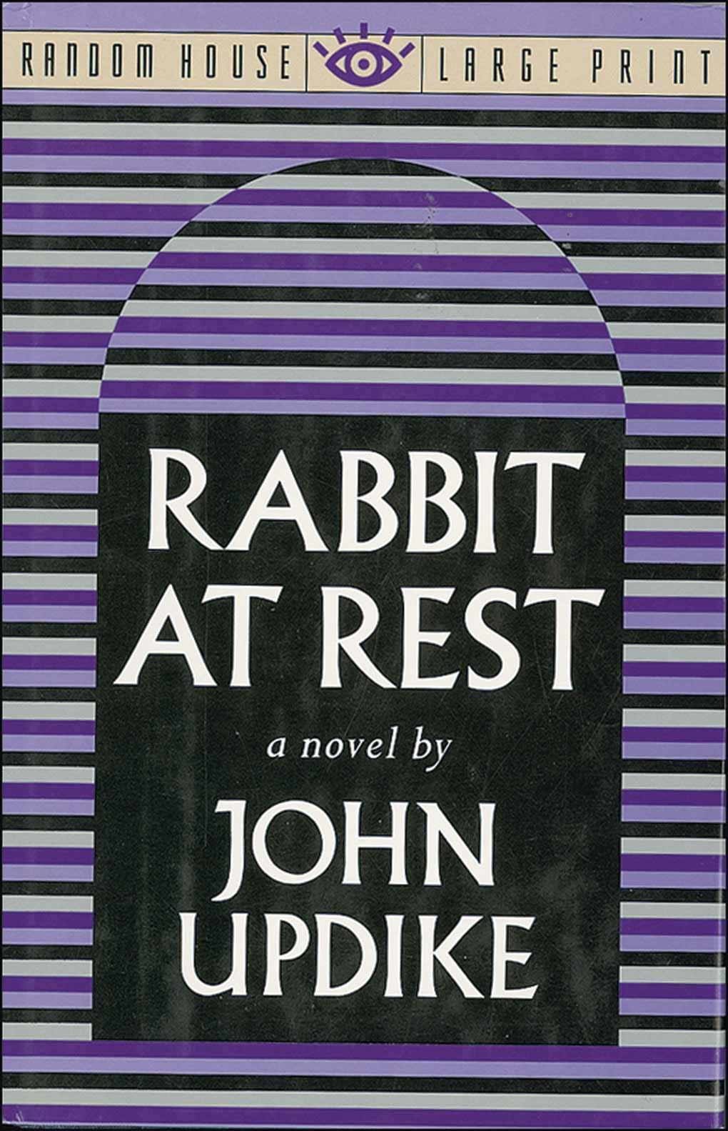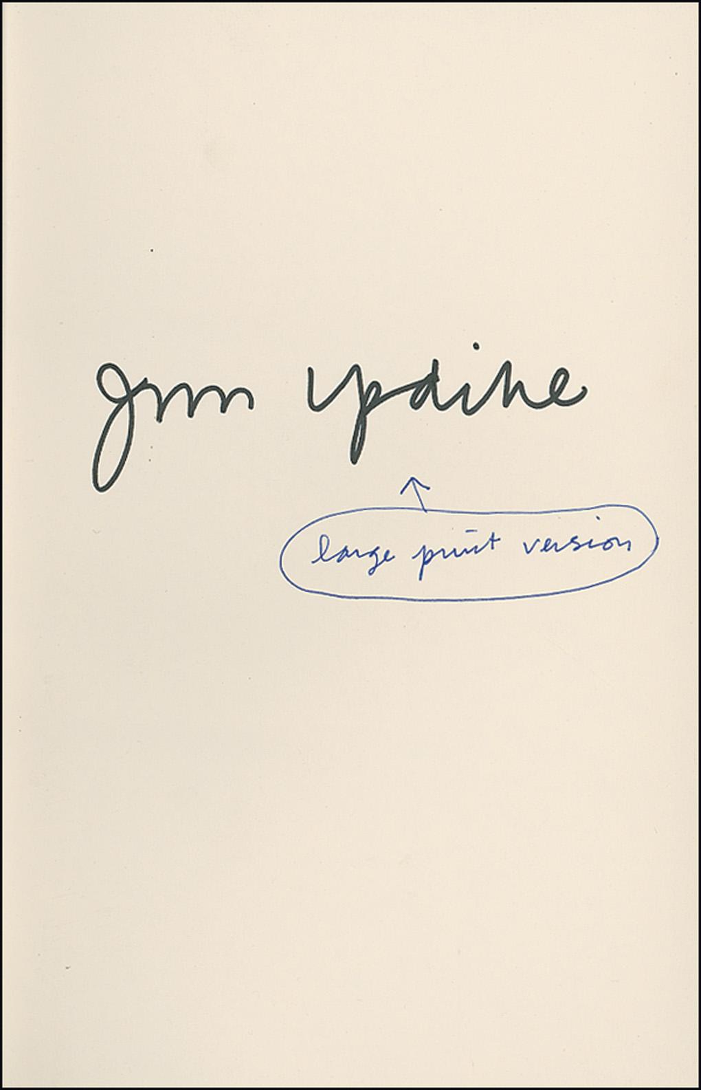 Signed book: Rabbit at Rest. Large print edition. NY: Random House, 1990. Hardcover with dustjacket, 6.5 x 9.5, 794 pages. Boldly signed in black felt tip on the front free end page, Updike adding in a different ink with an arrow pointing to his signature, “large print version.” Light wear to edges of jacket and book, otherwise fine condition.