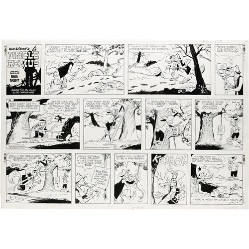 <B>John Ushler - Walt Disney's Uncle Remus and His Tales of Br'er Rabbit Sunday Comic Strip Original Art, dated 8-13-67 (Disney, 1967).</B></I> Br'er Rabbit tries to knock some sense into Br'er Fox with a country-style booby-trap. This beautifully drawn Sunday has an image area of 26" x 17.5", and the art is in Excellent condition.