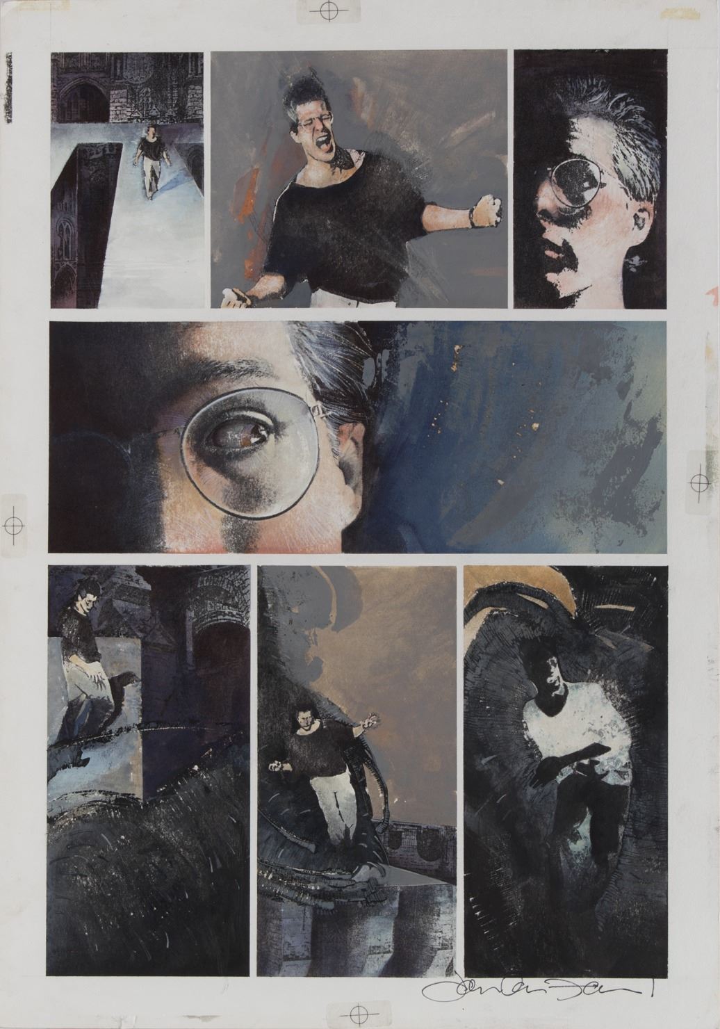 192. John Van Fleet original artwork for a Hellraiser #4 page. (Marvel, 1989) Accomplished in pencil, ink, and mixed media on 14 x 20 in. art board. Also includes (2) vellum leafs with some printing notes and captions. John Van Fleet deftly illustrated this terror tale from Clive Barker's well-known comic, book, and film series. A haunting and skillfully painted panel page. Signed by the artist lower right. In very good condition. $200 - $300