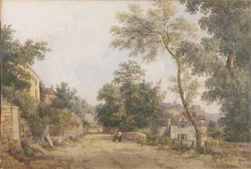 John Varley (1778-1842) watercolour, Figures on a lane passing houses, signed and dated 1838, 10 x 14.5 ins. £300-500