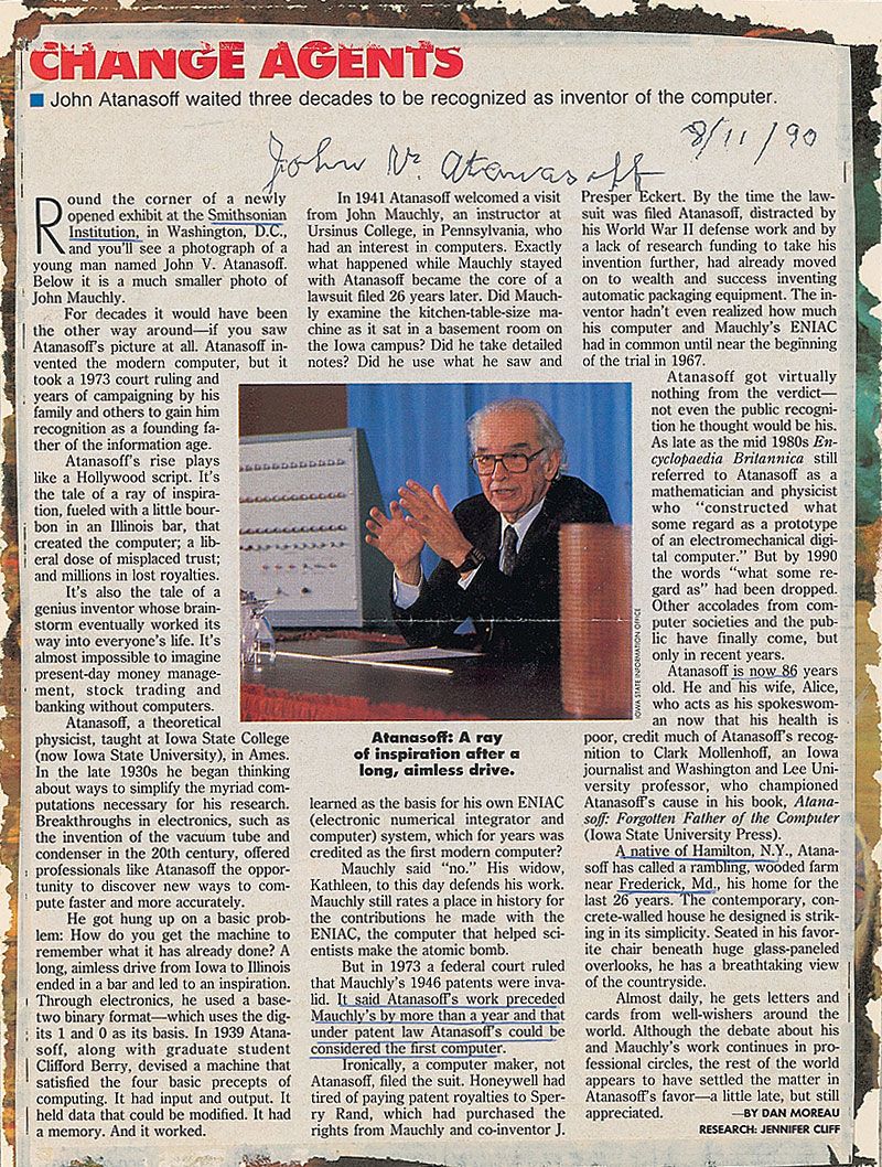 Physicist and inventor (1903–1995) best known for inventing the first electronic digital computer. Color magazine page, 7.5 x 10, with an article relating to Atanasoff inventing the computer, signed at the top in black ballpoint, “John V. Atanasoff 8/11/90.” Page is affixed to an identical size piece of heavy cardstock. Mounting remnants and paper loss to edges, and several underlined passages of article, otherwise fine condition.