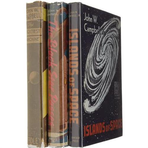 <B>John W. Campbell, Jr. Three First Editions.</B></I> Includes the following:<BR><B><I>The Mightiest Machine.</B></I></B></I> (Providence, RI: Hadley Publishing, 1935), first edition, 228 pages, green boards, 12mo, dust jacket. Condition (book/ dj): very good/ near very good.<BR><B><I>The Black Star Passes.</B></I></B></I> (Reading, PA: Fantasy Press, 1953), first edition, 254 pages, blue boards, 12mo, dust jacket. Condition (book/ dj): near fine/ very good.<BR><B><I>Islands of Space.</B></I></B></I> (Reading, PA: Fantasy Press, 1956), first edition, 224 pages, blue boards, 12mo, dust jacket. Condition (book/ dj): very good/ very good.<BR><BR><b>Shipping:</b> Books & Catalogs (<a target="_blank" href="http://www.heritageauctions.com/common/shipping.php">view shipping information</a>)