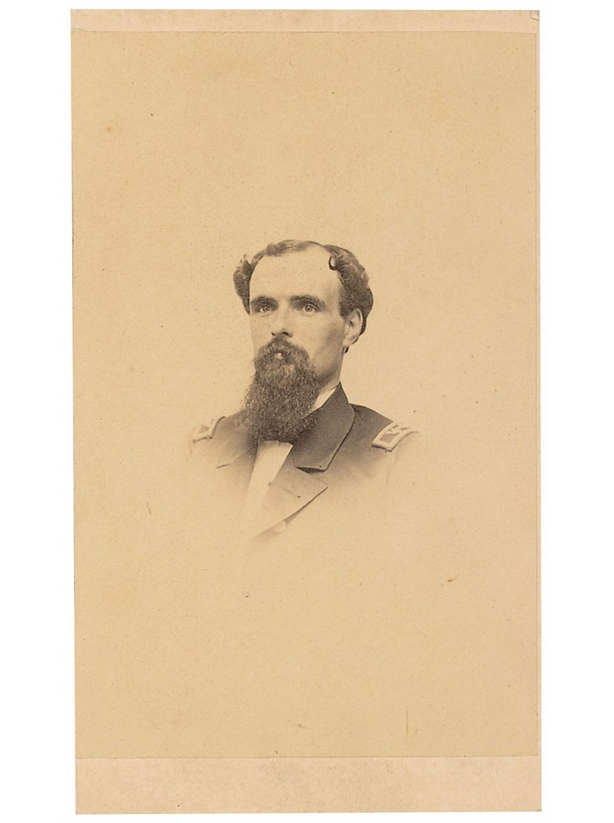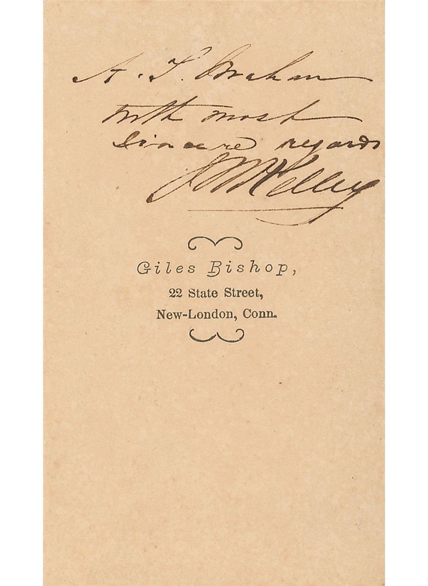 Union naval officer who was killed in action when his steamer Tecumseh was sunk in Mobile Bay on August 5, 1864. Original 2.25 x 4 carte-de-visite photo by Giles Bishop of New London, Connecticut, signed and inscribed on the reverse in black ink, “A. T. Mahan, with most sincere regards, J. W. Kelly.” In fine condition, with lightly trimmed left edge and a bit of mild toning.