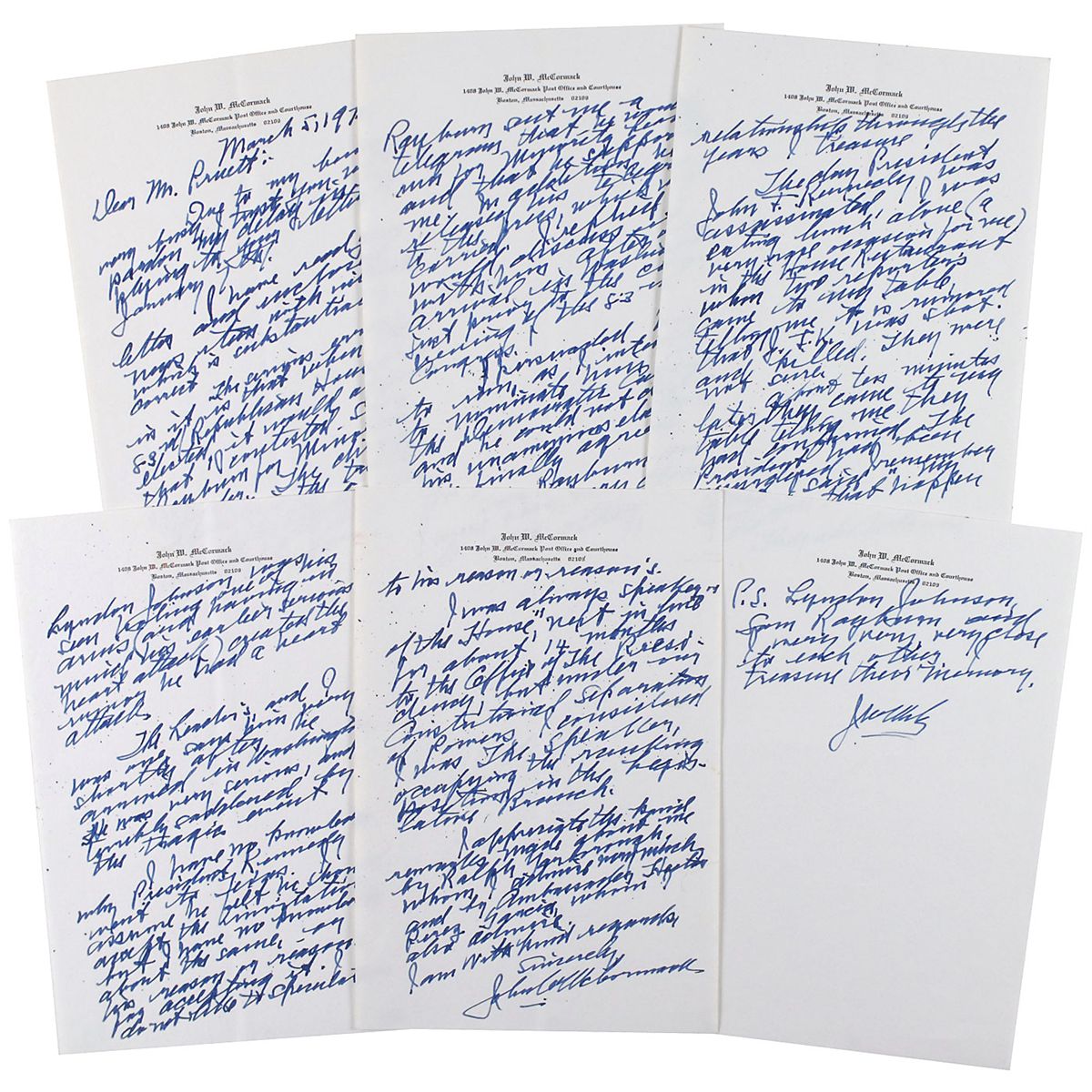 ALS, six pages, 6 x 9, personal letterhead, March 5, 1975. Letter to a gentleman. In part: “The day John F. Kennedy was assassinated I was eating lunch alone (a very rare occasion for me) in the House Restaurant when two reporters came to my table telling me it is rumored that J.F.K. was shot and killed. They were not sure. About ten minutes later they came to my table telling me they had announced The President had been murdered. I remember what I said, ‘My God, can that happen here?’ They also told me, ‘Lyndon Johnson was seen holding one of his arms (and having in mind his earlier serious heart attack) created the rumor he had a heart attack. The Leaders and I went and saw him very shortly after he arrived in Washington. He was very serious, and terribly saddened by the tragic event. I have no knowledge why President Kennedy went to Texas. I assume he felt he should accept the invitation, but I have no knowledge about the same, or his reason or reasons for accepting it. I do not like to speculate to his reason or reasons. I was always Speaker of the House ‘next in line’ for about 14 months to the Office of the Presidency.” In a postscript signed “J. W. McC.,” he adds, “Lyndon Johnson, Sam Rayburn and I were very, very close to each other. I treasure their memory.” In fine condition, with a small area of dampstaining to the bottom of the second page (affecting only two letters of his writing).