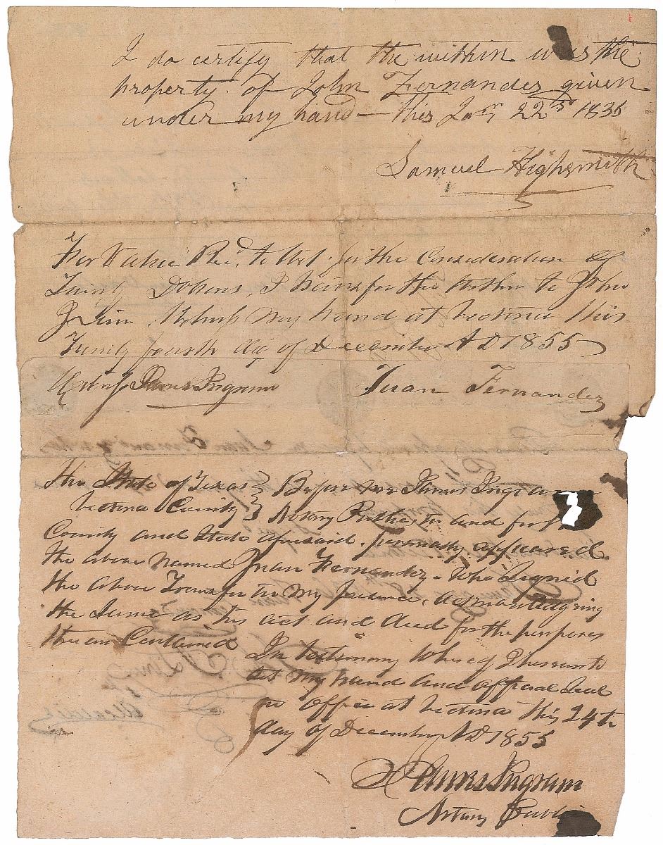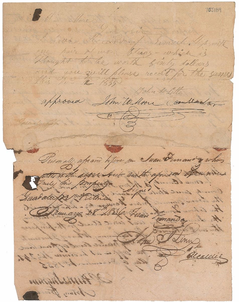 Politician, friend of William Barret Travis, and signer of the Texas Declaration of Independence (1797–1846). Autograph endorsement, “approved, John W. Moore,” on a manuscript document, one page both sides, 7.75 x 9.75, December 12, 1835. A receipt approved by Moore, in part: “I have Received of Samuel Highsmith one pair of work steers—which is thought to be worth sixty dollars.” In very good condition, with intersecting folds, overall dampstaining and toning, a few tears and holes, and show-through from writing to opposing sides. Provenance: The Robert Davis Collection.