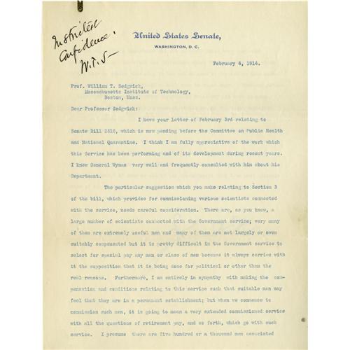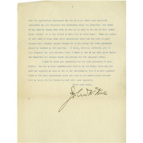<B>John W. Weeks: 2 Good Content Letters, as Senator and as Secretary of War.</B></I> Here is an opportunity to obtain two letters of the Secretary of War who served two presidents, Harding and Coolidge, well and faithfully. 1) Typed Letter Signed, <I>as Senator,</B></I> 2 pages, 8" x 10.5", on the letterhead of the United States Senate, Washington, February 6, 1914. To William T. Sedgwick at the Massachusetts Institute of Technology; Professor Sedgwick, a biologist, was a key figure in shaping federal Public Health policy. With an initialed note in Sedgwick's hand in upper left corner <I>"In strictest confidence - W.T.S.".</B></I> Held by bracket, upper left, and Fine. In part: <I>"There are, as you know, a large number of scientists connected with the Government service; very many suitably compensated but it is pretty difficult in the Government service to select for special pay any man or class of men because it always carries with it the supposition that it is being done for political or other than reasons.''</B></I> 2) Typed Letter Signed, as secretary of war, 1 page, on the letterhead of the War Department, Washington, April 14, 1922. To the Hon. Benjamin Loring Young. Bearing the faintest imprint of a paper clip at top, else Fine. Listing the three men from Massachusetts who won the Congressional Medal of Honor in World War I. In part: <I>"Private George Dilboy, deceased... Private 1st Cl. Michael J. Perkins, deceased... Major Charles W. Whittlesey, deceased... The records of First Lieutenant William Bradford Turner show that he was born in the State of Massachusetts but when appointed temporarily an officer during the World War, his residence was that of New York State".</B></I> The Congressional Medal of Honor is the nation's highest military award for "uncommon valor" and given for actions that are above and beyond the call of duty in combat against an armed enemy. The names of those awarded them will always be remembered. From the Henry E. Luhrs Collection. Accompanied by LOA from PSA/DNA.