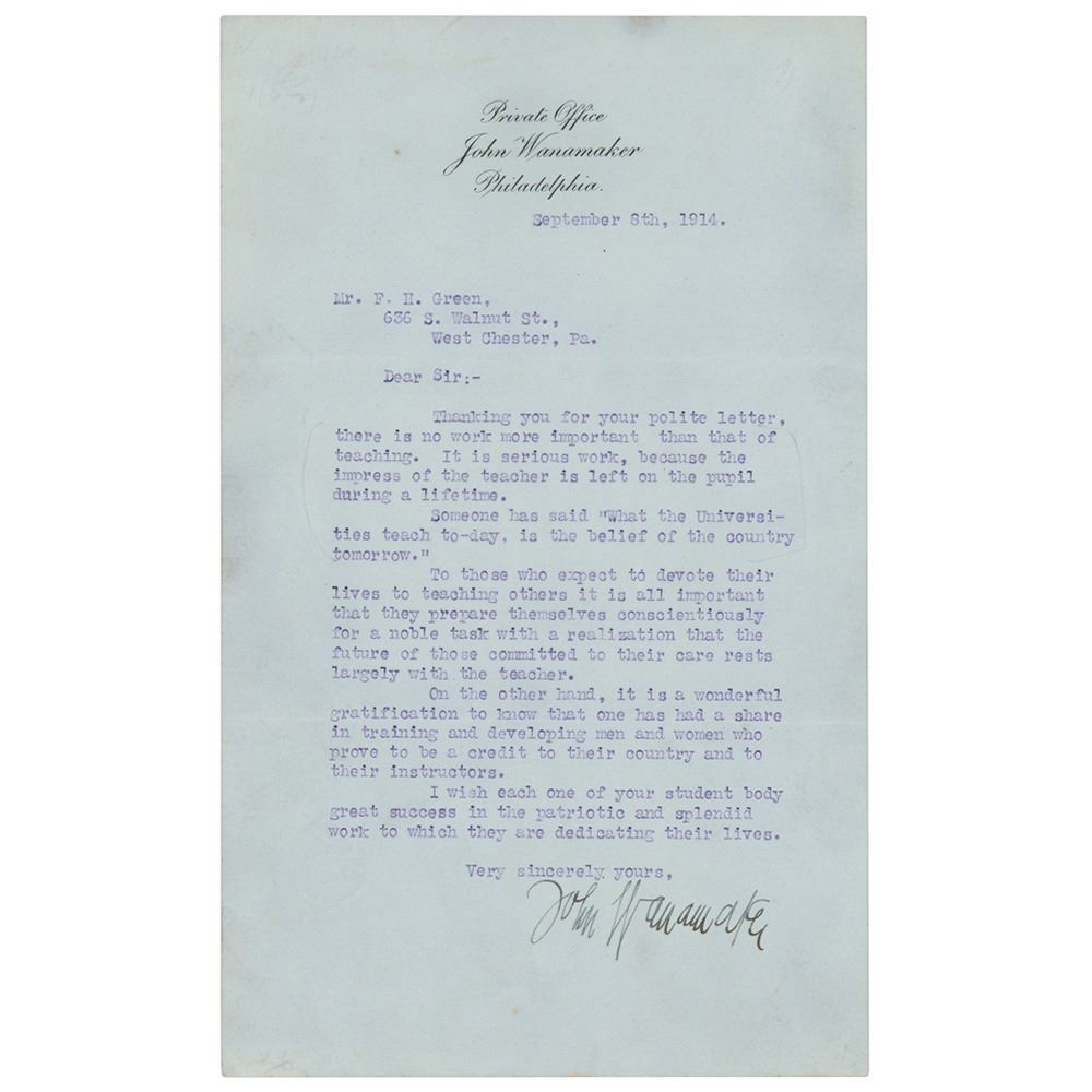 TLS, one page, 5.5 x 9, personal letterhead, September 8, 1914. Letter to F. H. Green, commenting on the vocation of teaching. in full: "Thanking you for your polite letter, there is no work more important than that of teaching. It is serious work, because the impress of the teacher is left on the pupil during a lifetime. Someone has said 'What the Universities teach to-day, is the belief of the country tomorrow.' To those who expect to devote their lives to teaching others it is all important that they prepare themselves conscientiously for a noble task with a realization that the future of those committed to their care rests largely with the teacher. On the other hand, it is a wonderful gratification to know that one has had a share in training and developing men and women who prove to be a credit to their country and to their instructors. I wish each one of your student body great success in the patriotic and splendid work to which they are dedicating their lives." In fine condition.