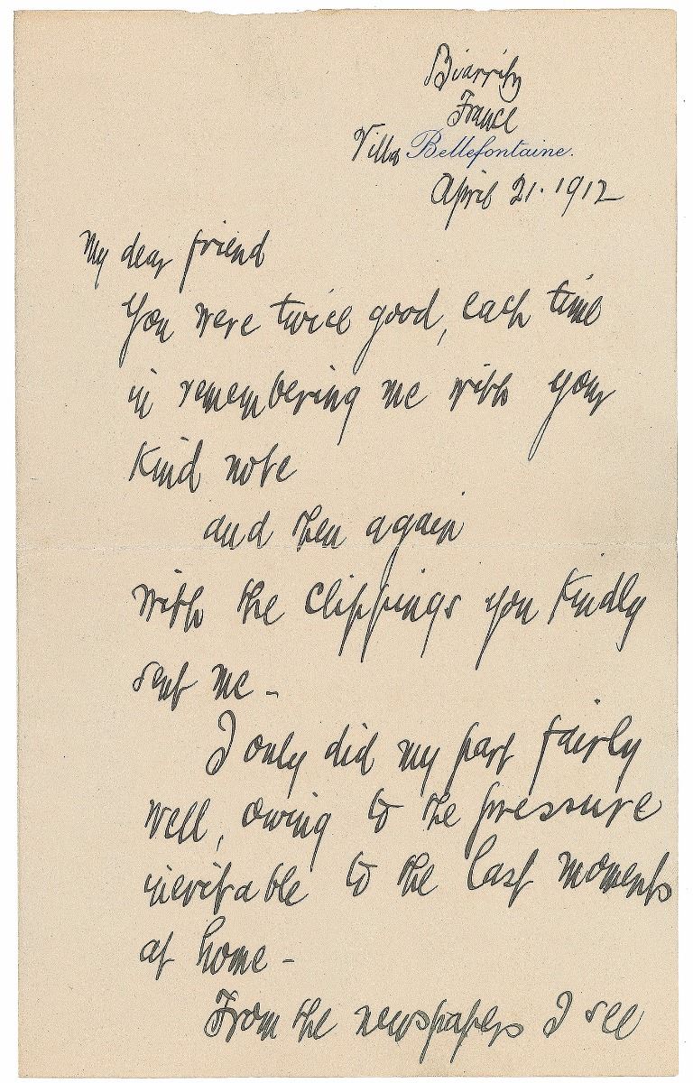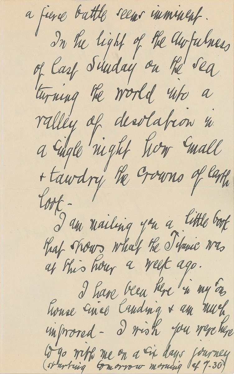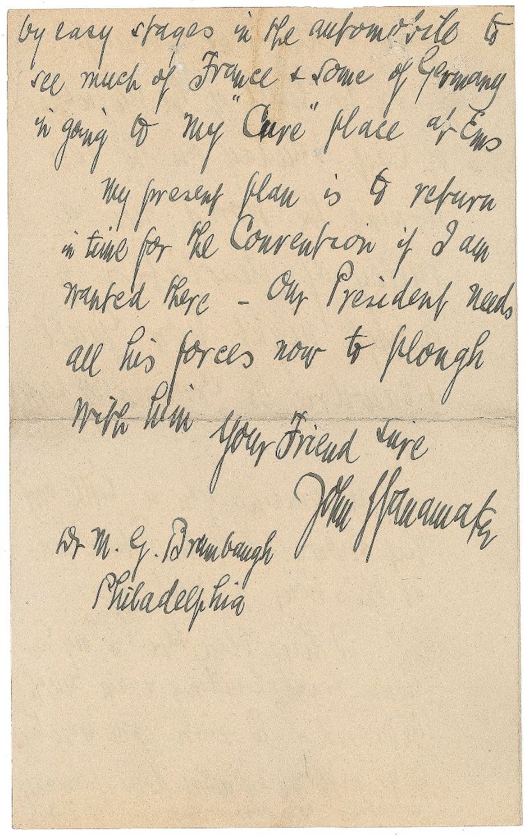 Department store magnate (1838–1922) who also served as Postmaster General from 1889 to 1893. ALS, three pages on two adjoining sheets, 5 x 8, Bellefontaine letterhead, April 21, 1912. Letter to Dr. M. G. Brumbaugh, in full: “You were twice good, each time in remembering me with your kind note and then again with the clippings you kindly sent me—I only did my part fairly well, owing the pressure inevitable to the last moments at home—From the newspapers I see a fierce battle seems imminent. In the light of the awfulness of last Sunday on the sea turning the world into a valley of desolation in a single night how small and tawdry the crowns of earth look. I am mailing you a little book that shows what the Titanic was at this hour a week ago. I have been here in my own house since landing & am much improved— I wish you were here to go with me on a six days journey (starting tomorrow morning at 7.30) by easy stages in the automobile to see much of France & some of Germany in going to my ‘Cure’ place at Ems. My present plan is to return in time for the Convention if I am wanted there—Our President needs all his forces now to plough with him.” In fine condition. One of Wanamaker’s claims to fame was that the American Marconi station constructed atop the Wanamaker Store in New York City was the very first channel to receive word of the Titanic sinking. While many dispute such a boast, Wanamaker’s coastal station proved an invaluable source of information for those seeking updates on the disaster; the novel use of radio for long-distance communication created widespread publicity about the unprecedented value of wireless technology during a possible state of emergency.